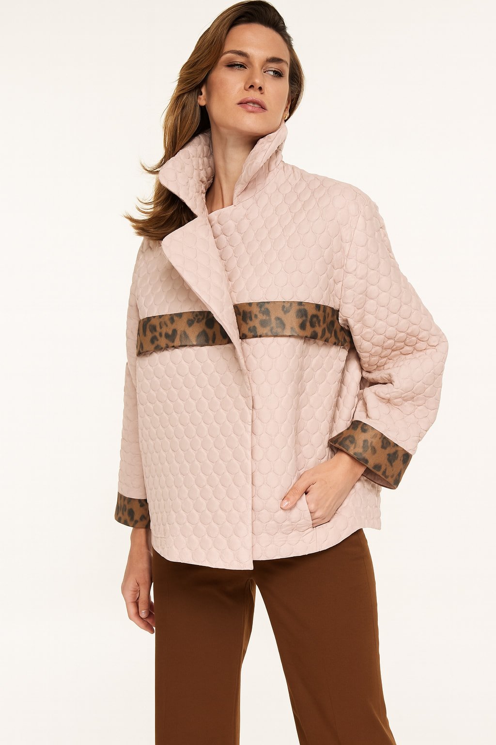 Bej Rengi Daire Kapitone Leaopar Kombinli Trenç