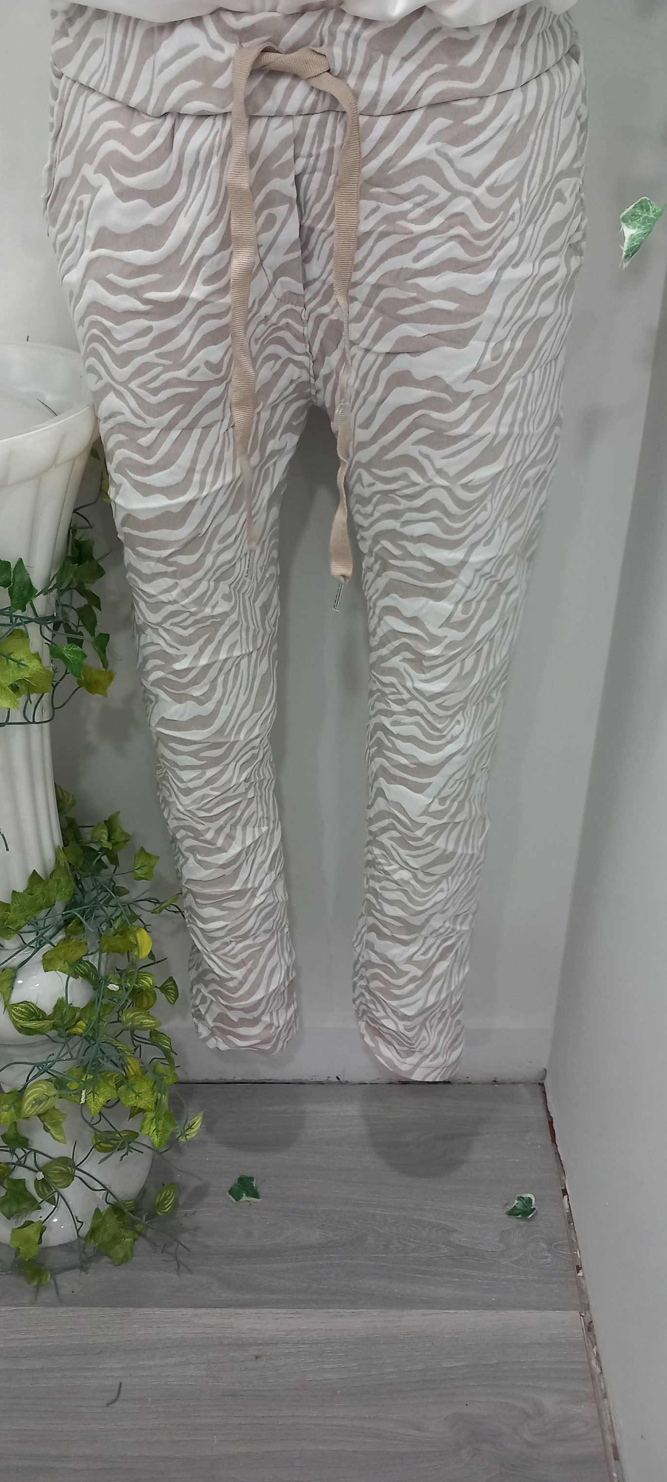 Bu şık ve modern beyaz-bej renkli likralı pantolon, zebra deseniyle dikkat çekiyor. Şıklığı ve rahatlığı bir arada sunan bu pantolon ile her ortamda öne çıkabilirsiniz. Trendy ve şık bir görünüm elde etmek isteyenler için ideal bir seçim!