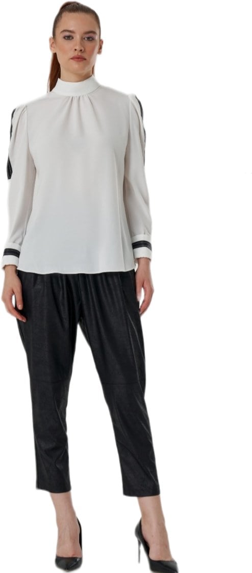 Beyaz Dik Yaka Büzgülü Kol Siyah Şeritli Krep Bluz