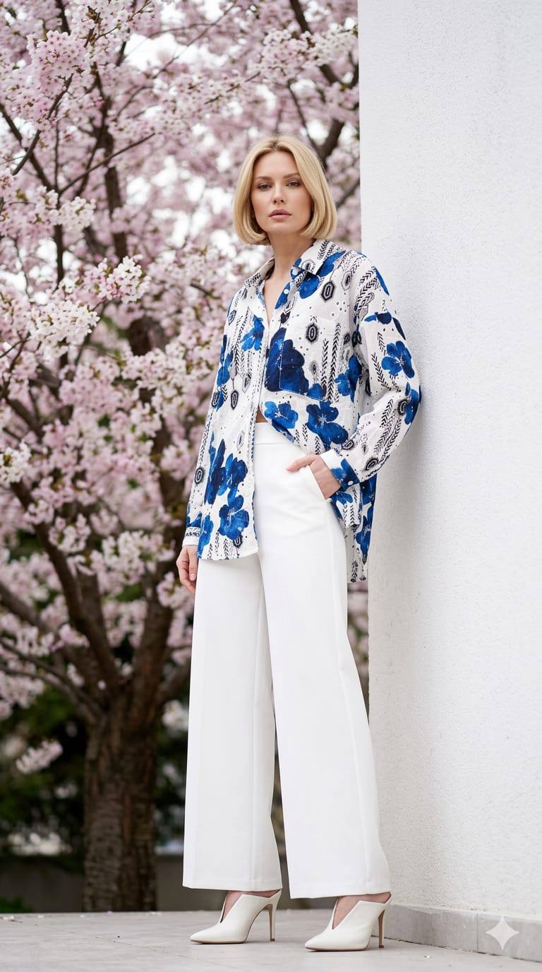 Beyaz İtalyan Üstünde Lacivert İşlemeli Çiçekleri Olan Salaş Gömlek
