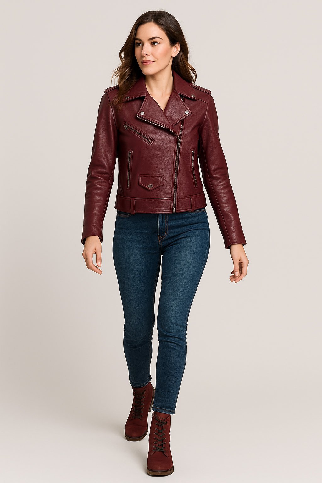 Bordo Hakiki Deri Fermuar Detaylı Yaka Zımbalı Ceket