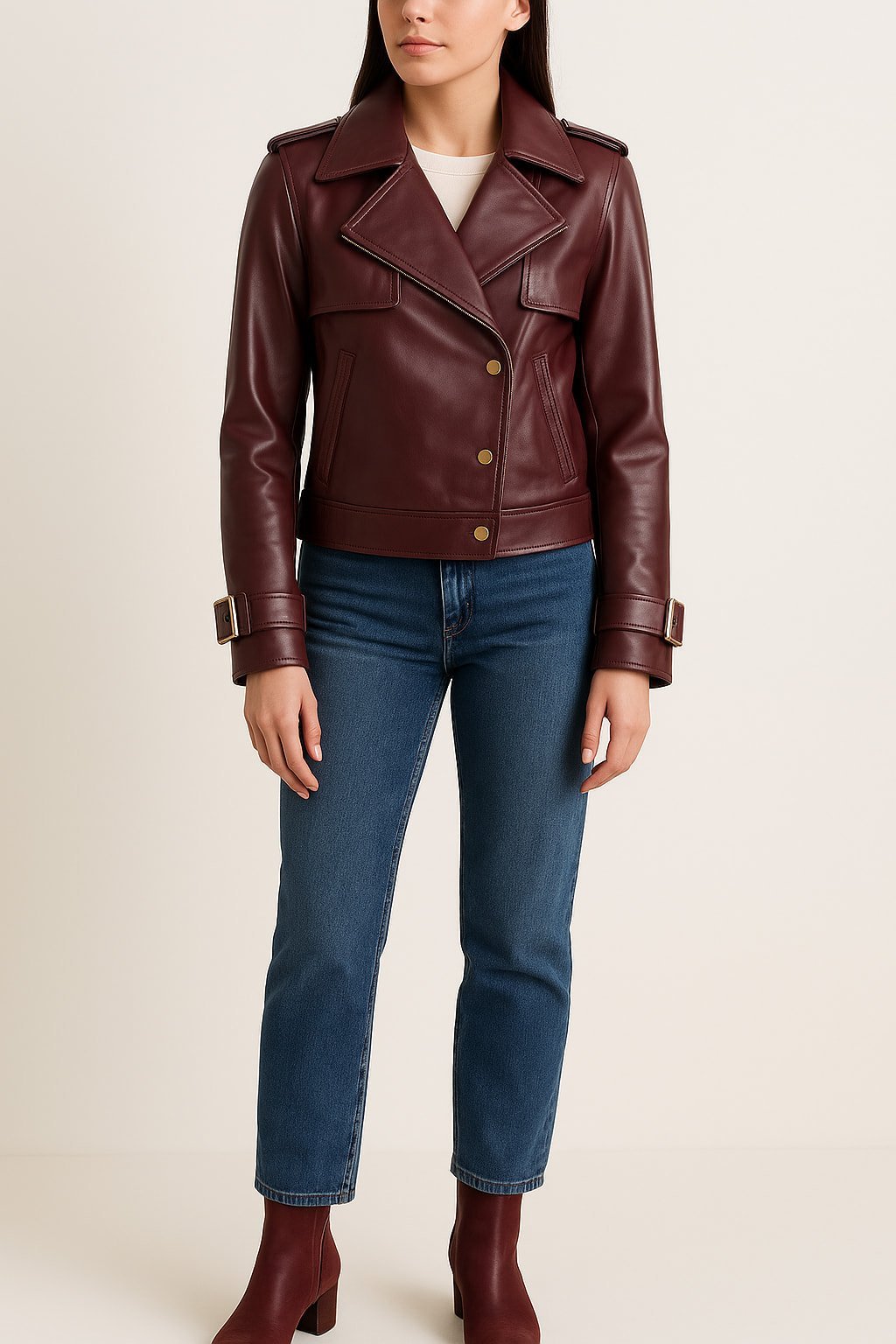 Bordo Rengi Hakiki Deri Büyük Yakalı Kolunda Tokalı Bantlı Olan Ceket