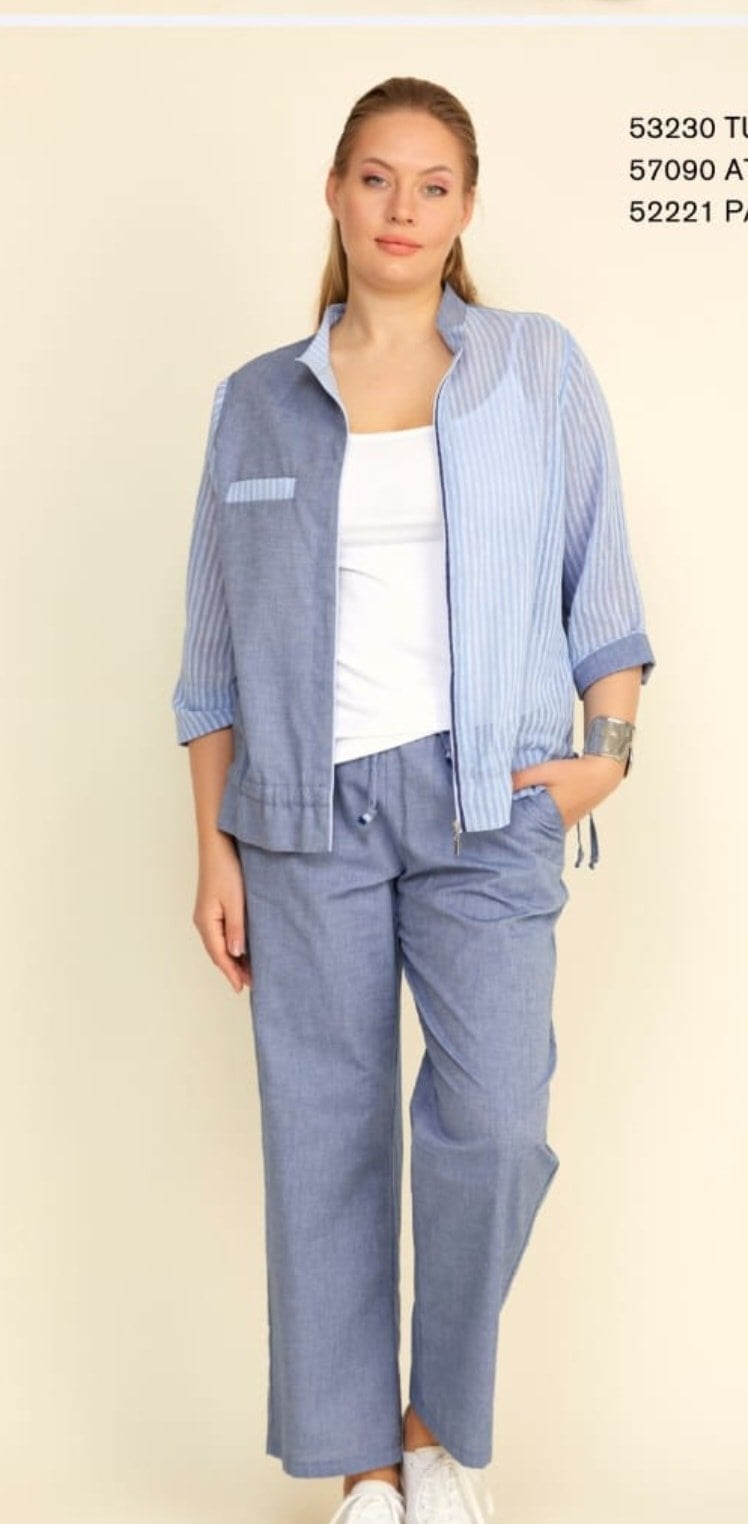 Büyük Beden Mavi Çizgili Fermuarlı Keten Kumaş Gömlek Ceket