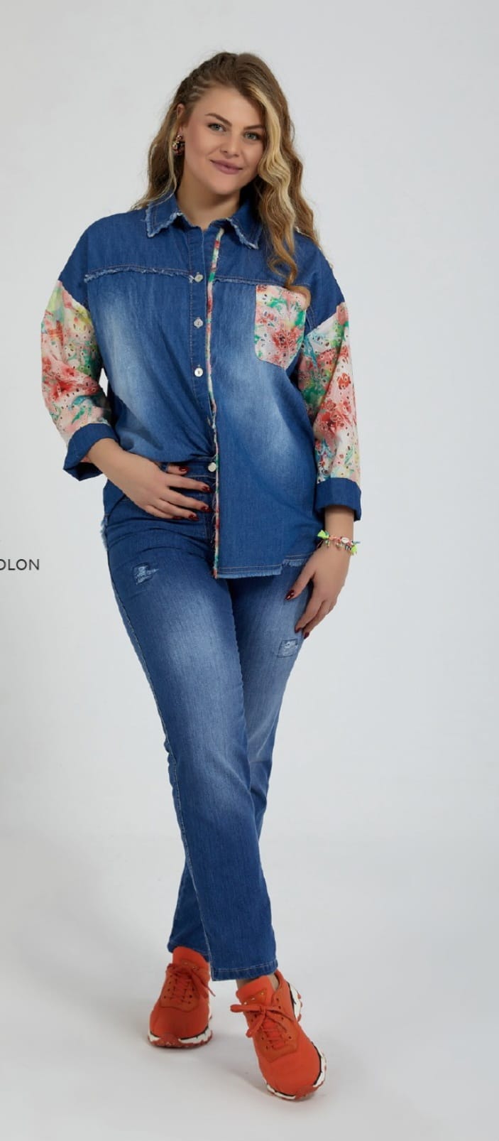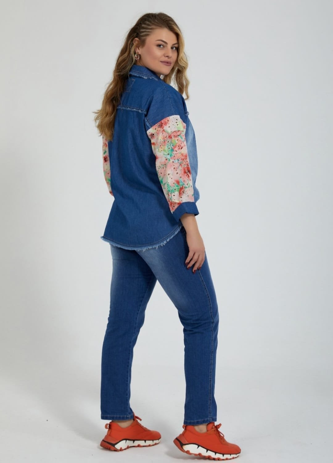 Büyük Beden Pembe Fisto Desenli Kumaş Kombinli Jean Gömlek Ceket