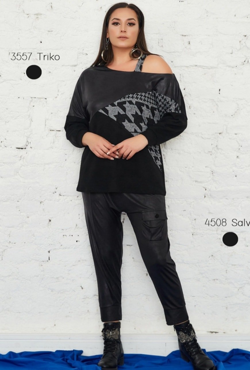 Büyük Beden Siyah Kazayagı Kombinli Omuz Esprili Tunik
