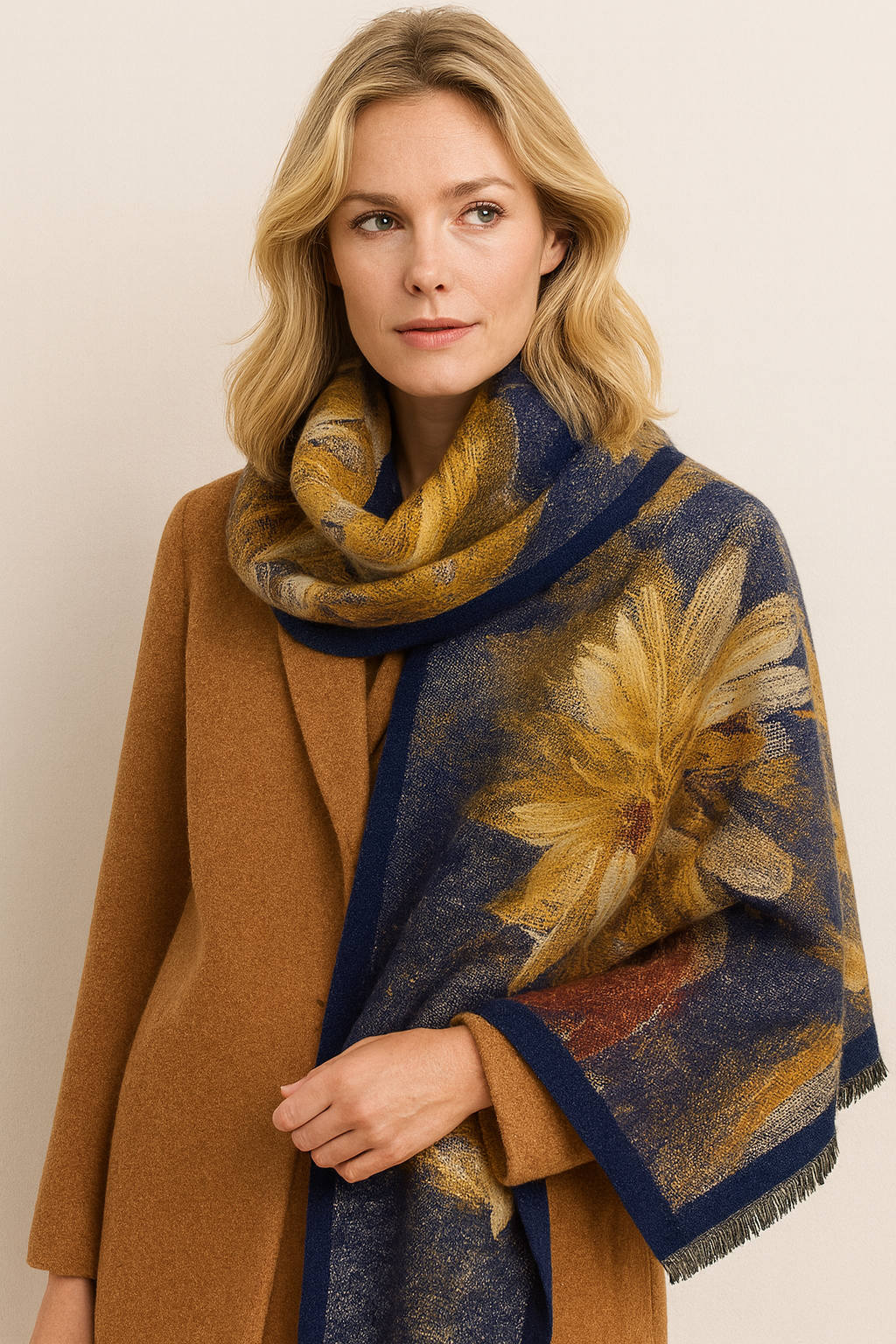 Camel Lacivert Büyük Desenli Şal