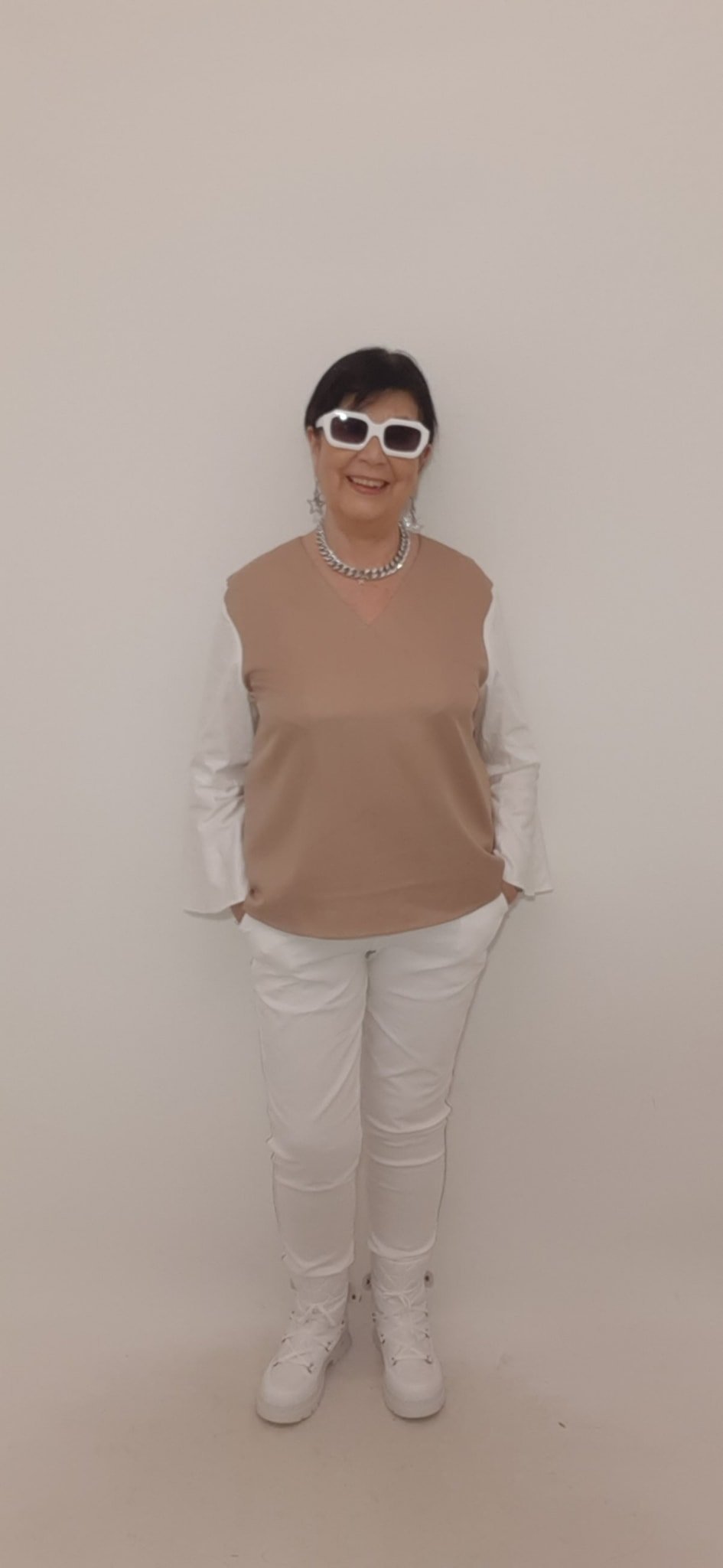Camel Rengi Kolları Volanlı Beyaz V Yaka Bluz