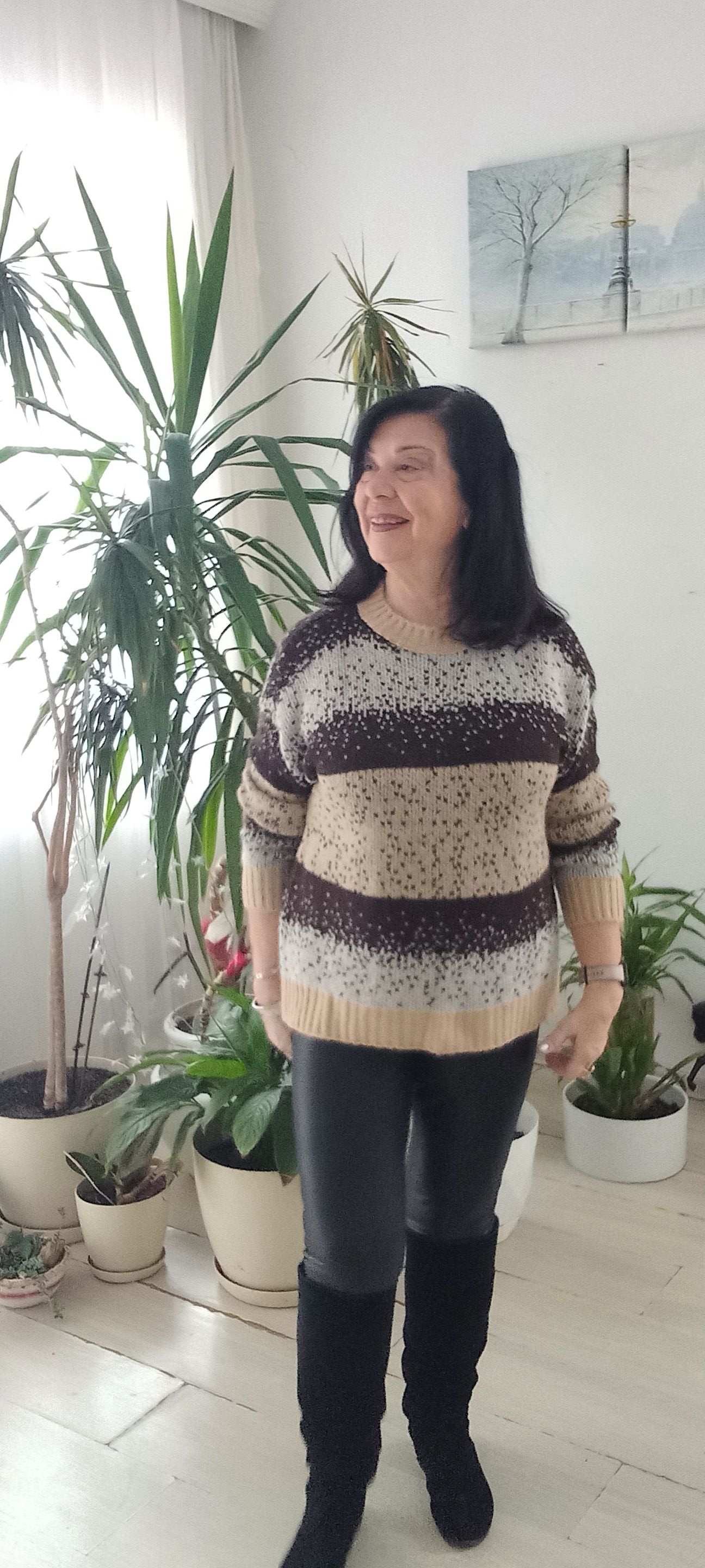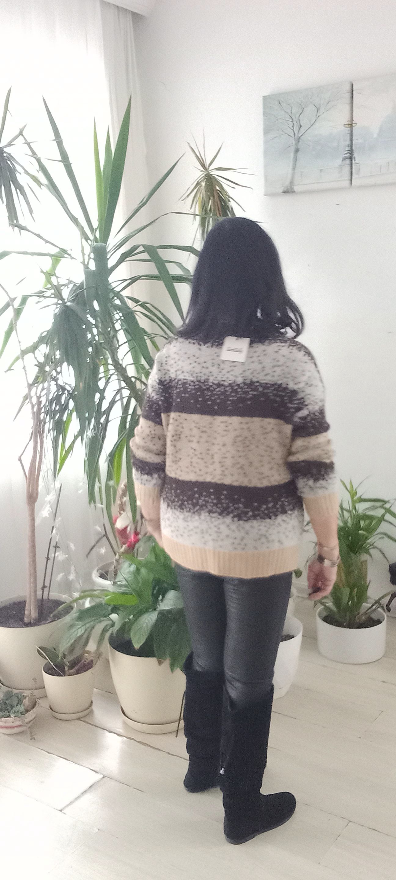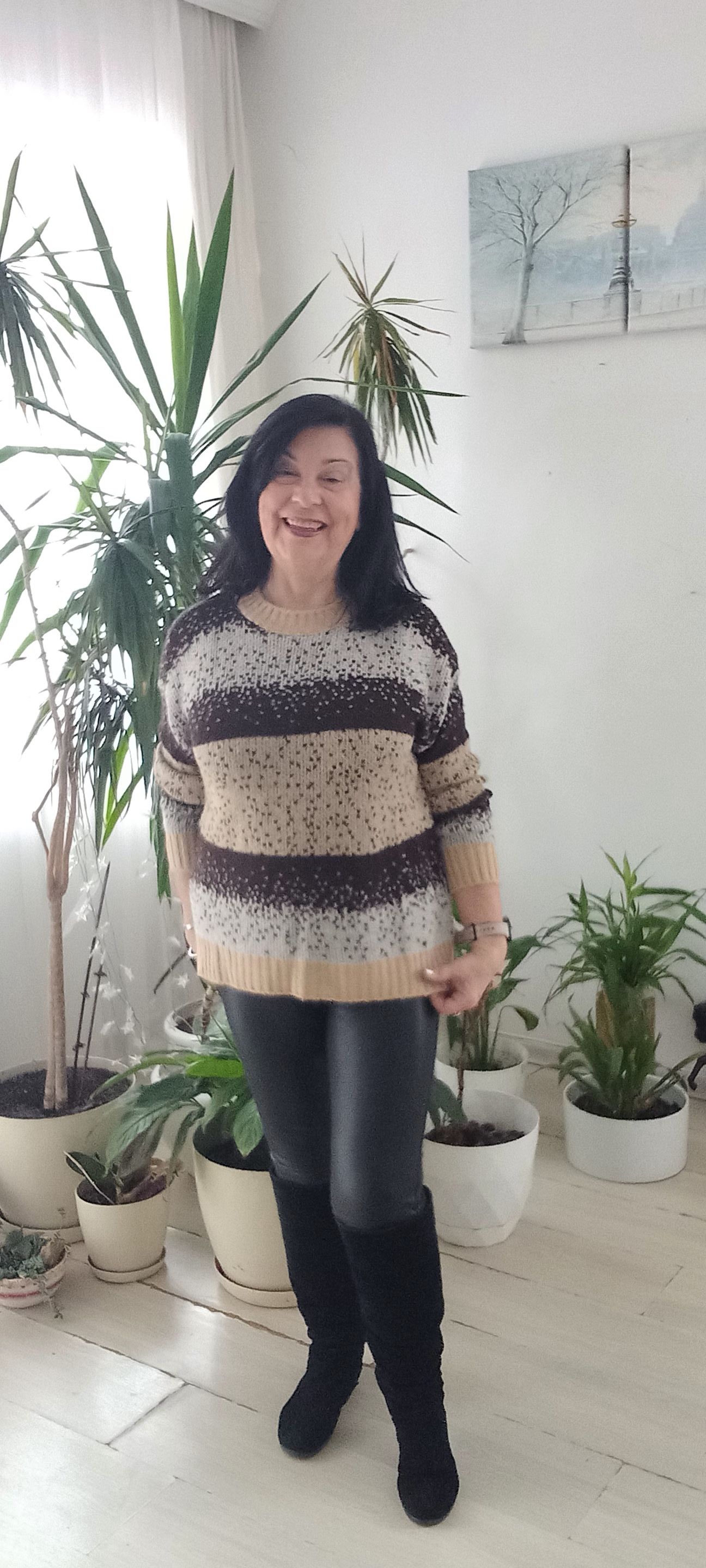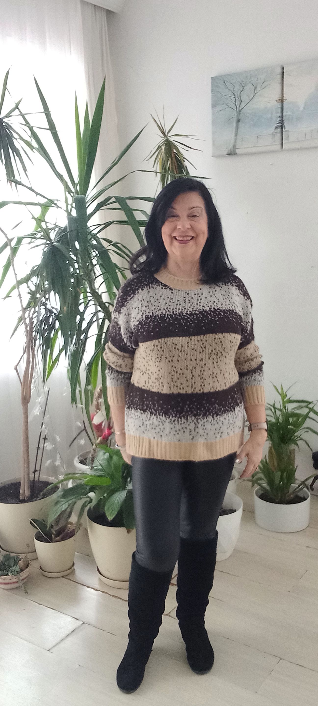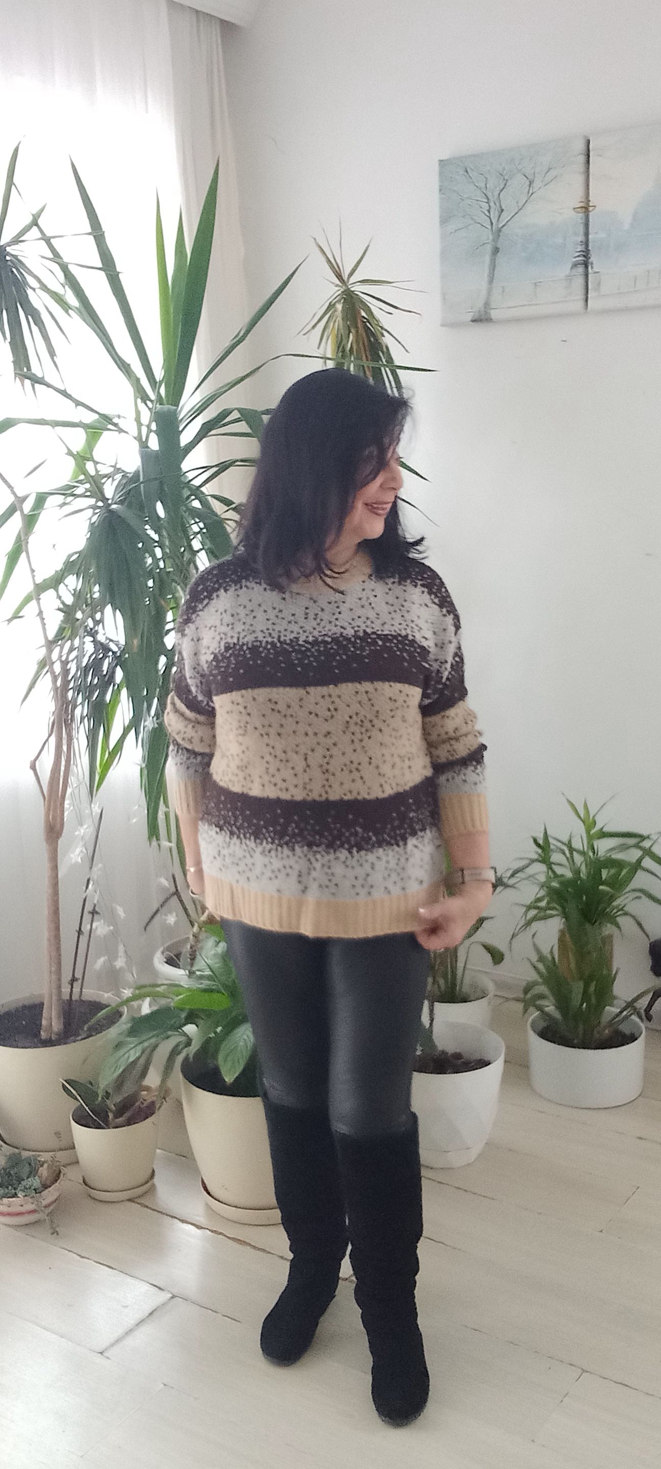Çizgili Bej Siyah Kemik Kar Taneli İtalyan Triko