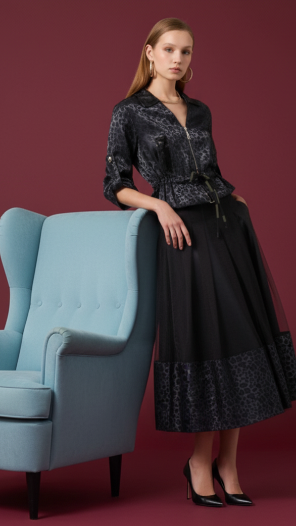 siyah tül etek, saten leopar desenli etek, şık kadın etek modelleri, kombin etek tasarımları, özel gün etekleri, feminen şık etek.