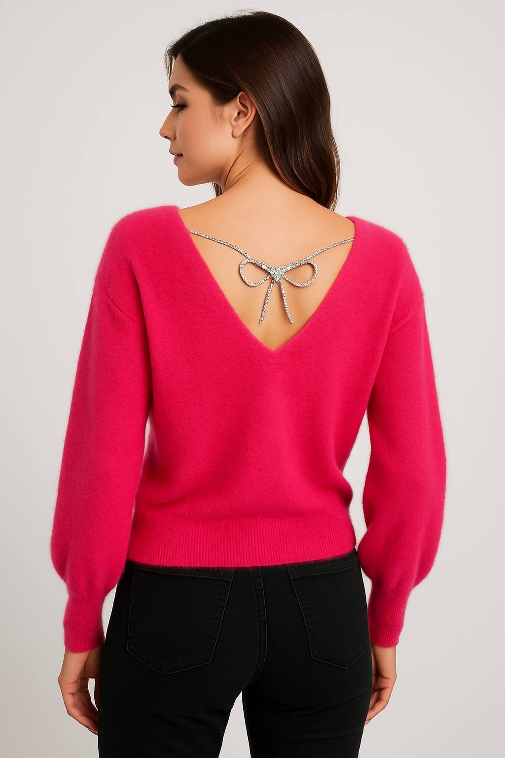 Fuşya Ön Arka V Yaka Arkasında Fiyonk Şeklinde Aksesuarı Olan Triko Kazak