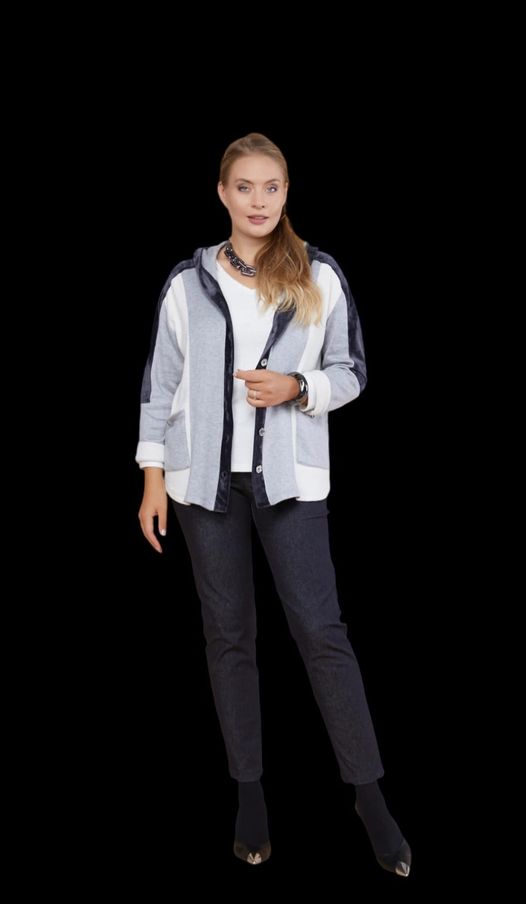 Gri Beyaz Dügmeli Kapşonlu Cepli Triko Kumaş Ceket Modeli Hırka