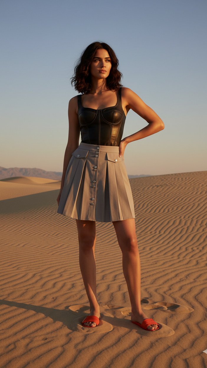 Gömlek ve topuklularla ofis şıklığına, tişört ve spor ayakkabılarla günlük konfora uyarlanabilen bu çıtçıtlı pileli etek, gardırobun vazgeçilmez parçalarından biri olacak.