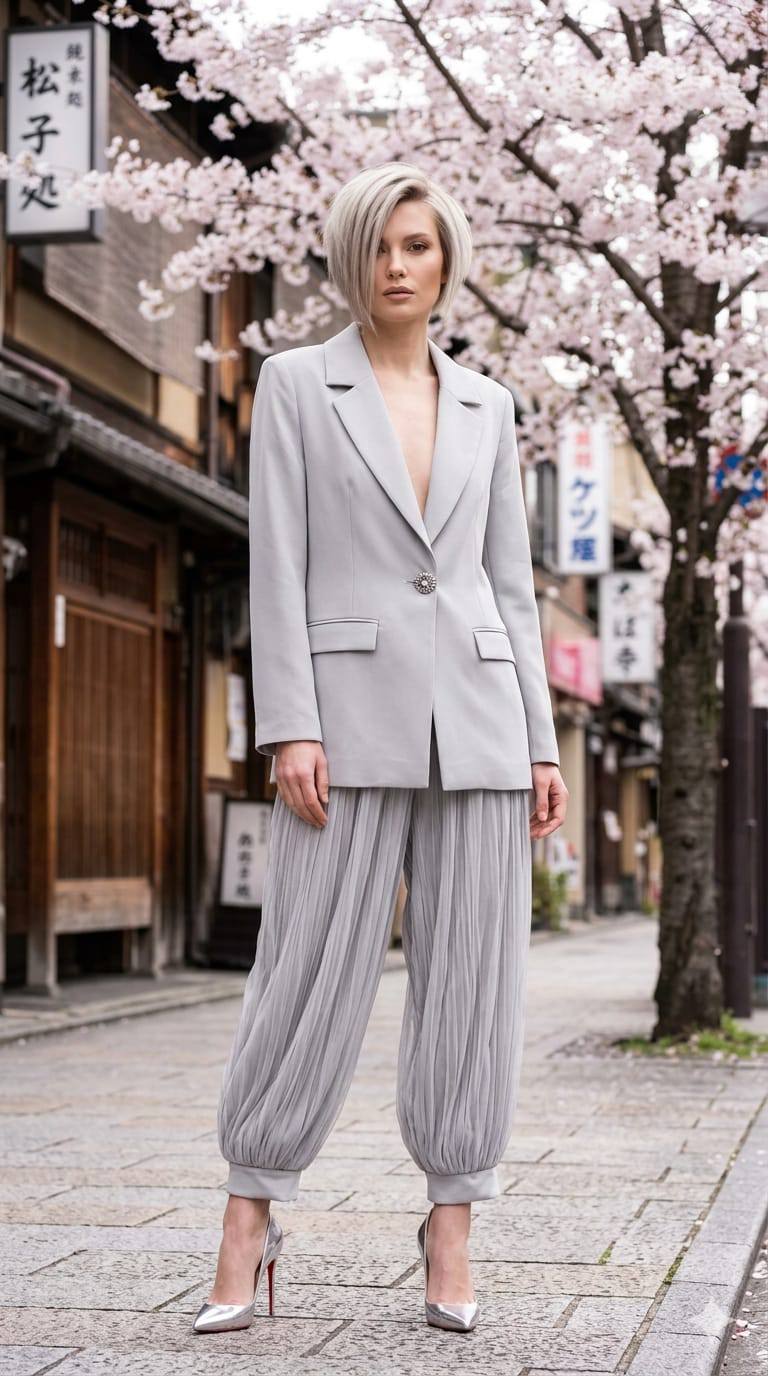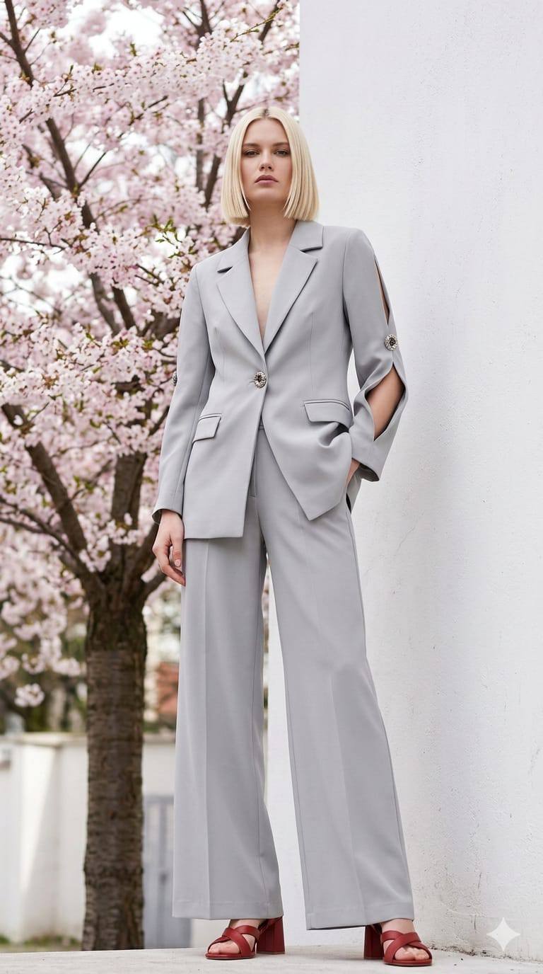 Gri Dökümlü Kumaş Koll Detaylı Gümüş Rengi Dümeleri Olan Tasarım Ceket