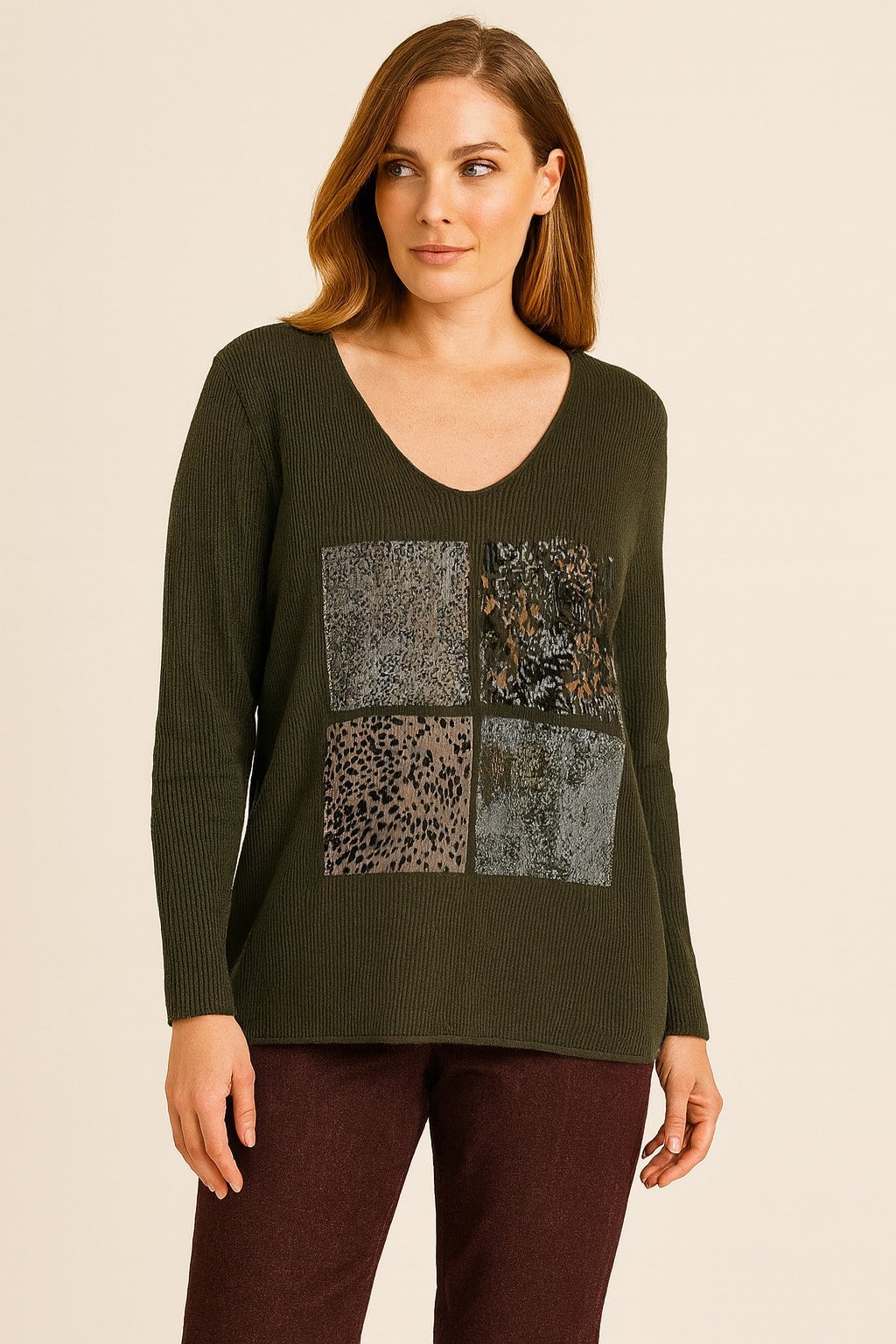 Haki Yeşil İtalyan Viskon Bluz Öönünde Leopar Deseni Olan Triko