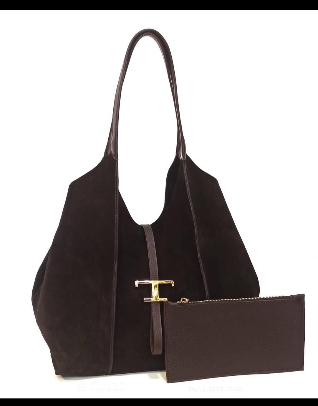 Hakiki Suet Deri Kahve Rengi Onünde Tokası İçinde Yavrusu Olan Hacimli Çanta