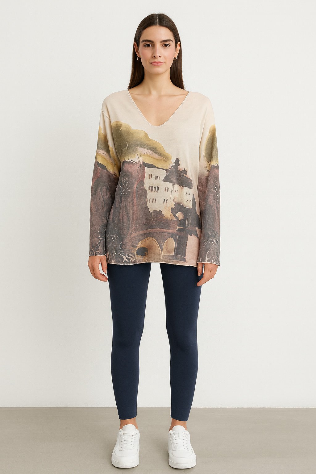İtalyan Bej Rengi Pano Desenli V Yaka Bluz Yumusacık