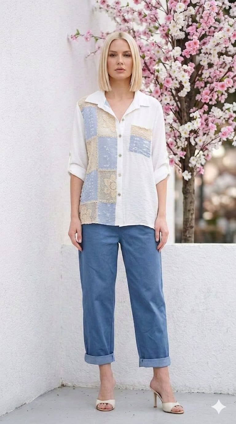 İtalyan Beyaz Bir Tarafı İşlemeli diger Tarafında Cep Olan Vual Gömlek