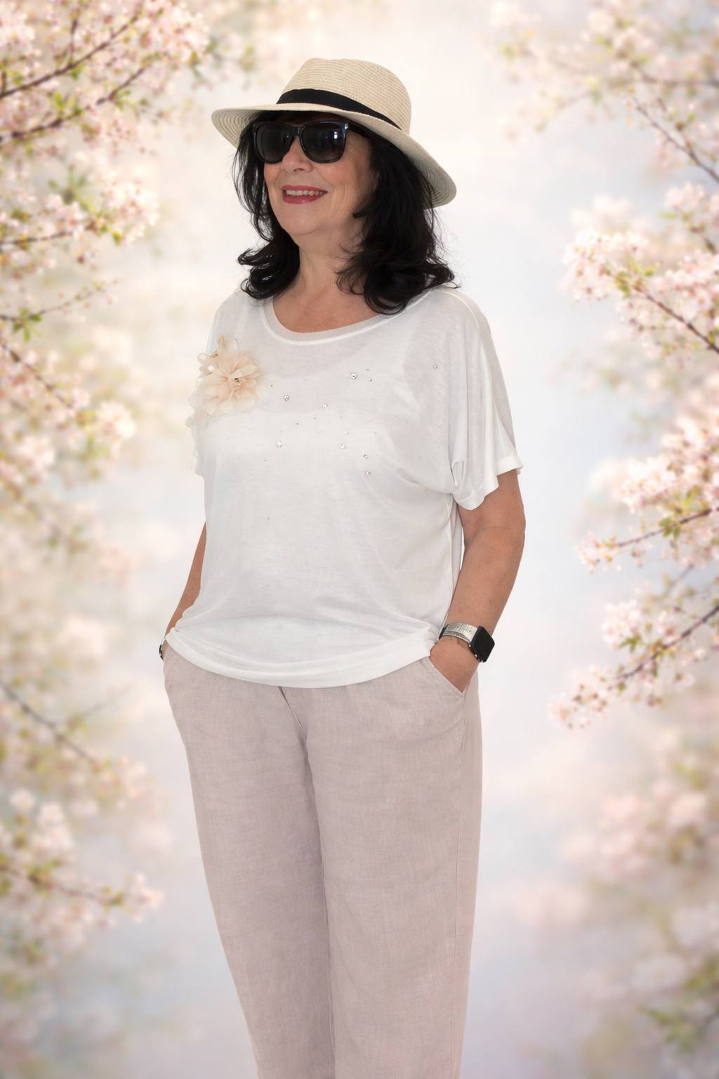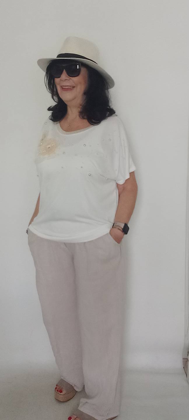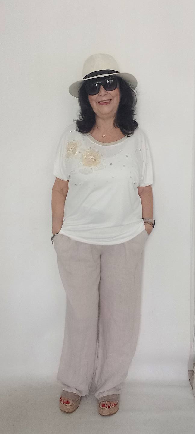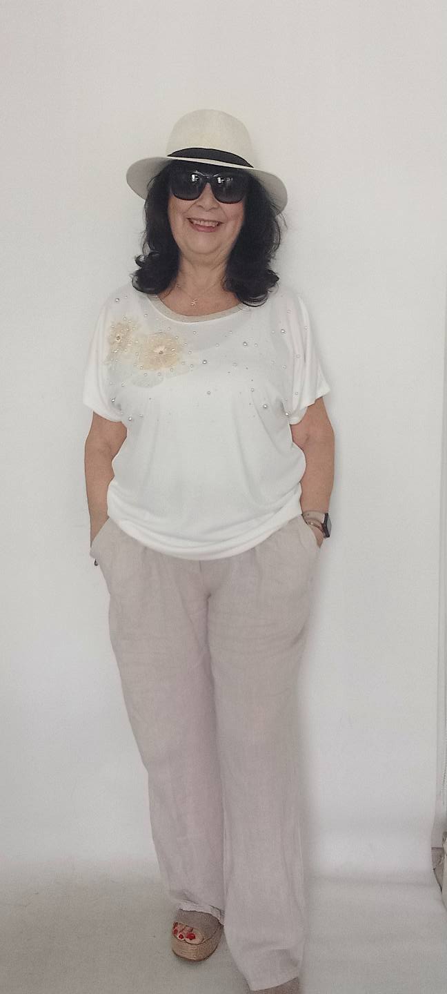 İtalyan Beyaz Üstünde Bej Rengi Organze Çiçekleri İncilerle İşlenmiş Bluz