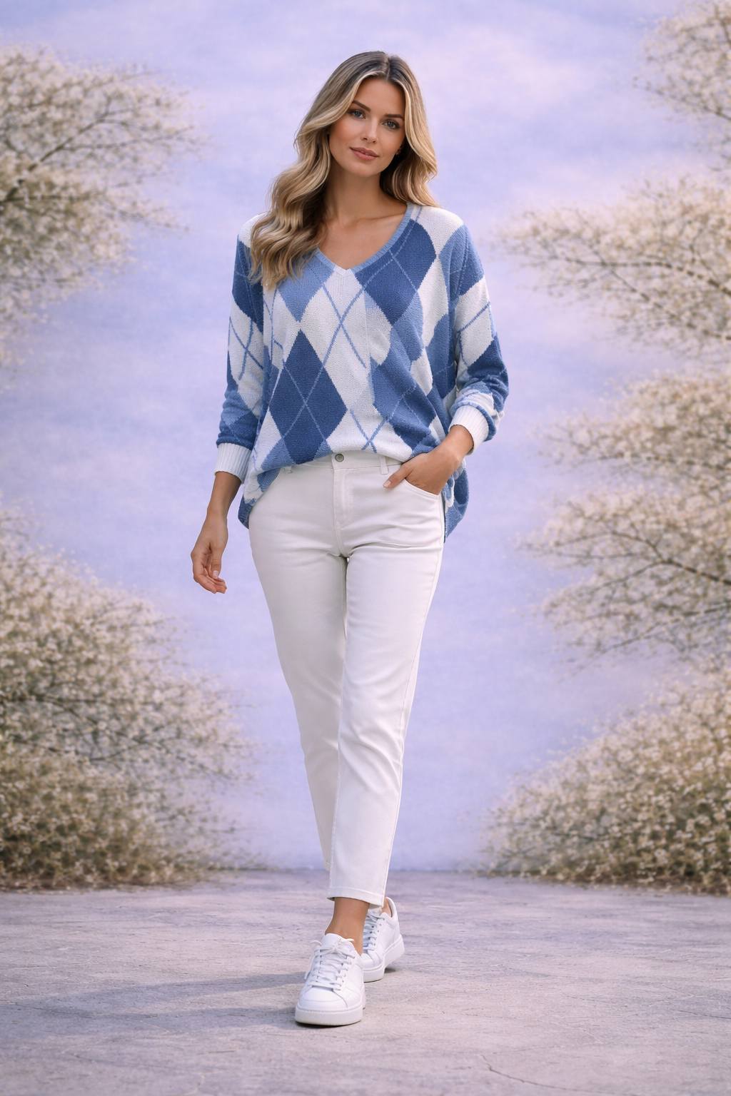 İtalyan Beyaz Ve Saks Rengi Baklava Desenli Merserize Triko Bluz