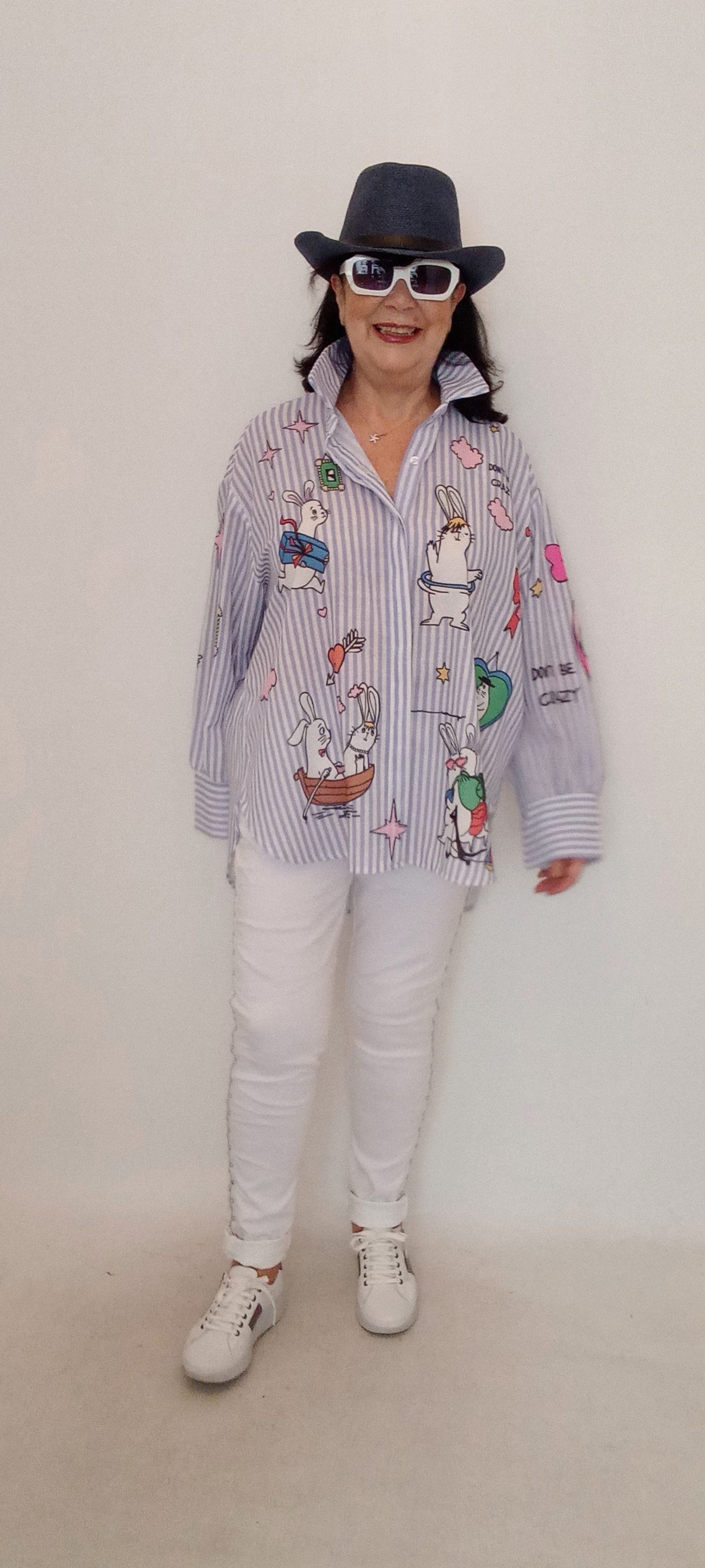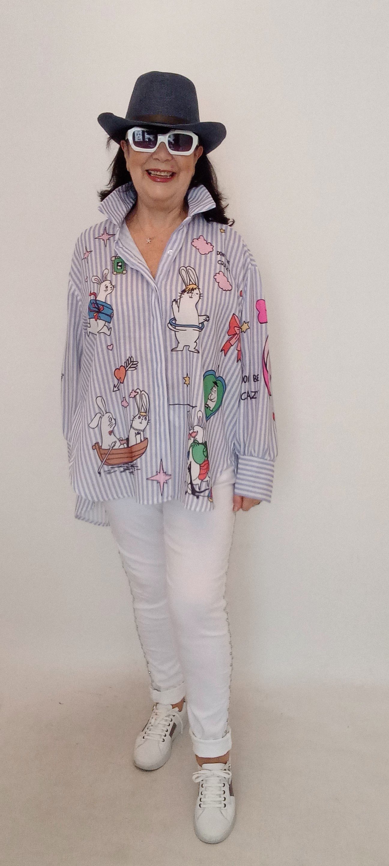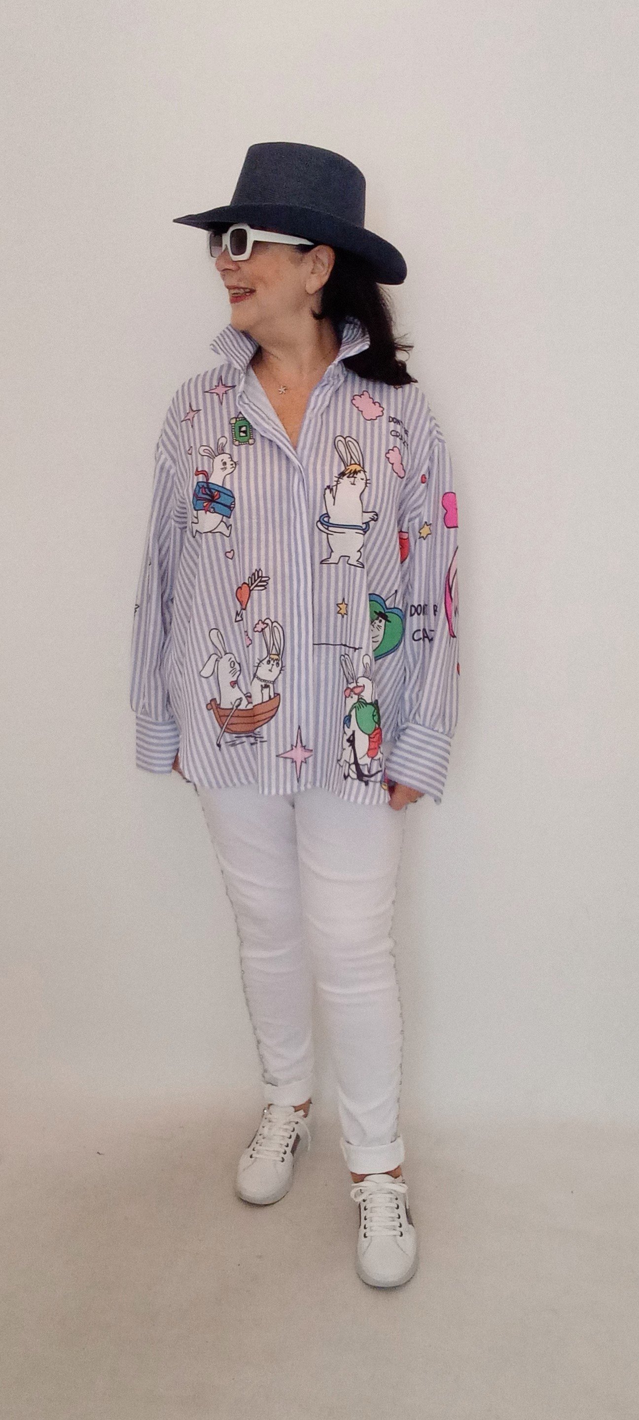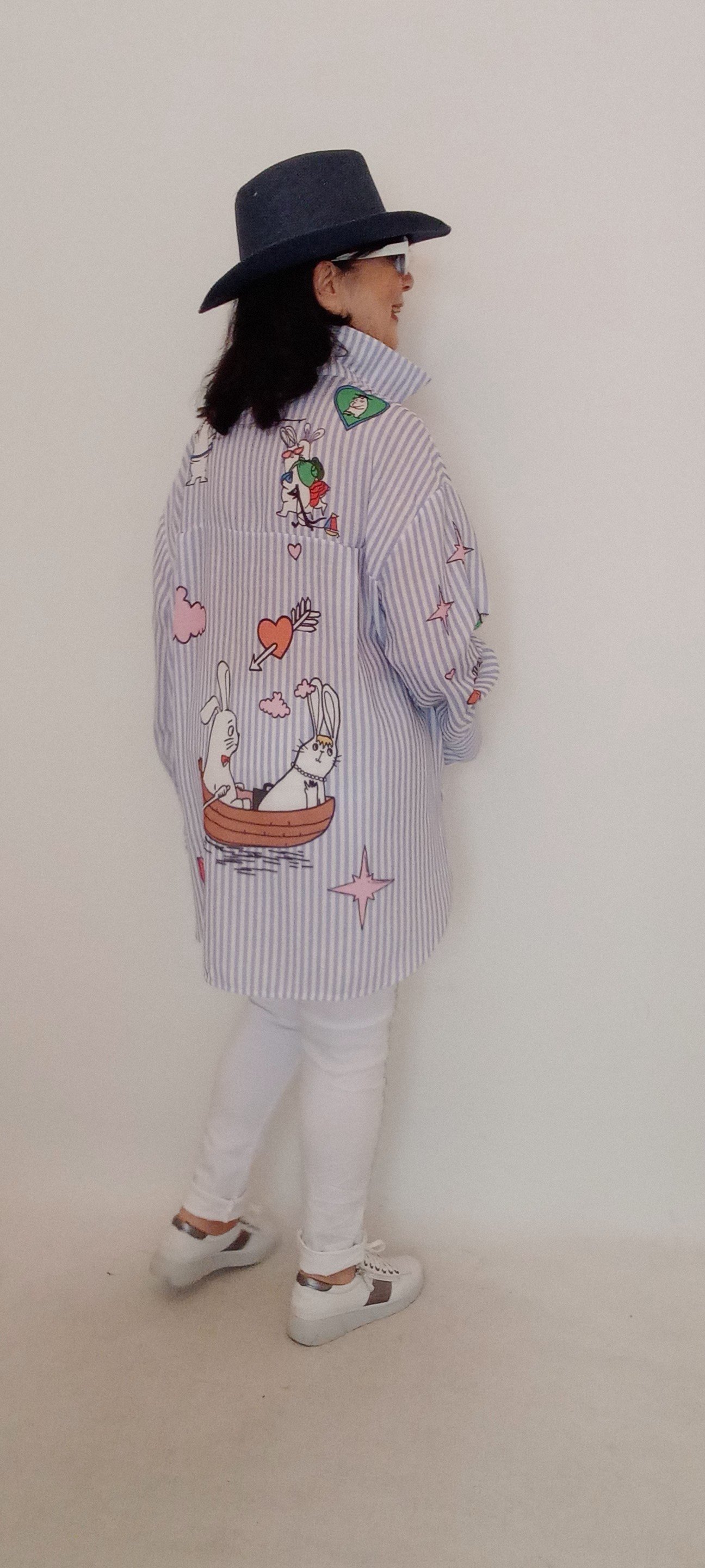 İtalyan Çizgili Poplin Gömlek Animal Aplikeli - Mavi