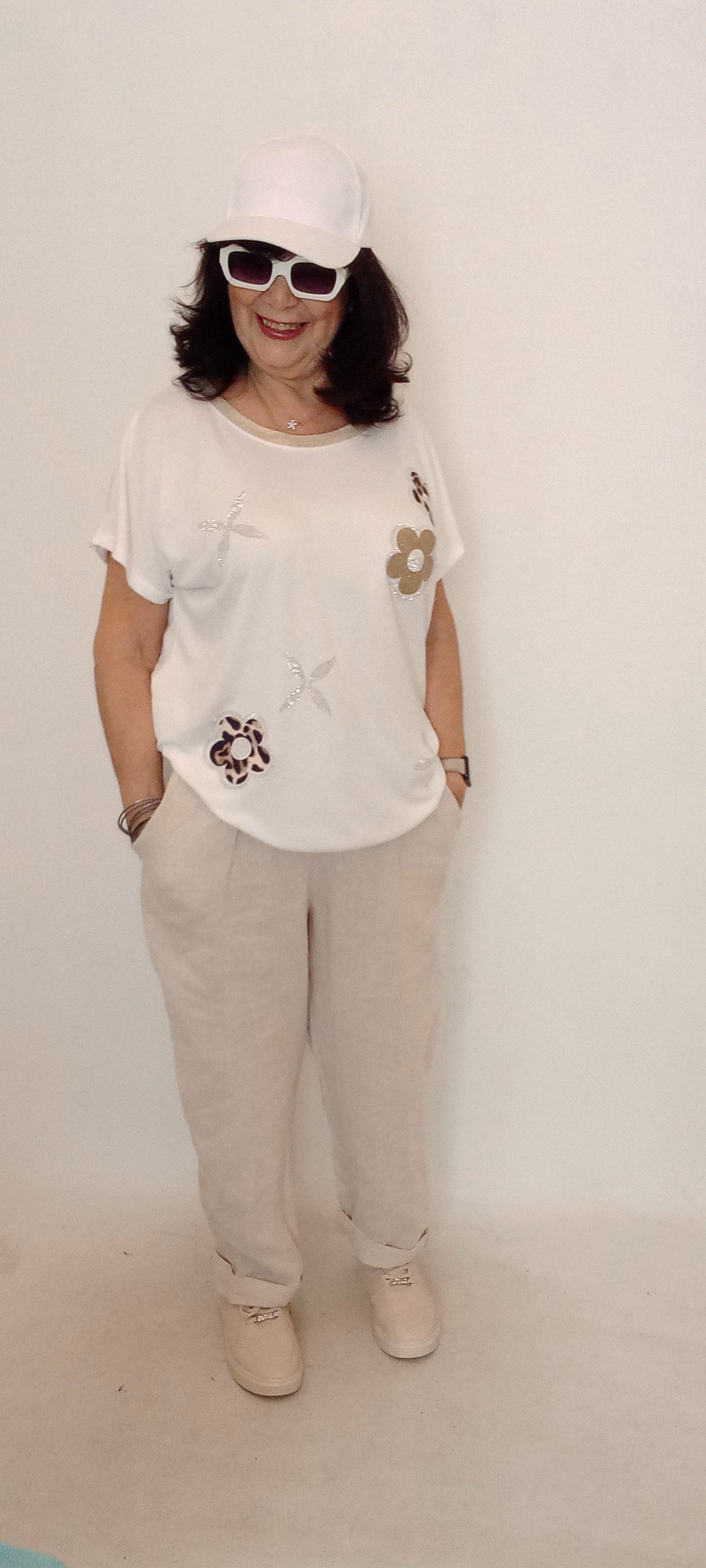 İtalyan Cotton Çiçek Aplikeli Taşlı Kısa Kollu Bluz - Beyaz