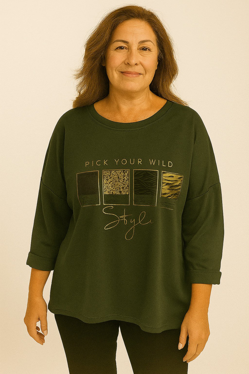 İtalyan Haki Yeşil Yuvarlak Yaka Dore Yazılı Sweet