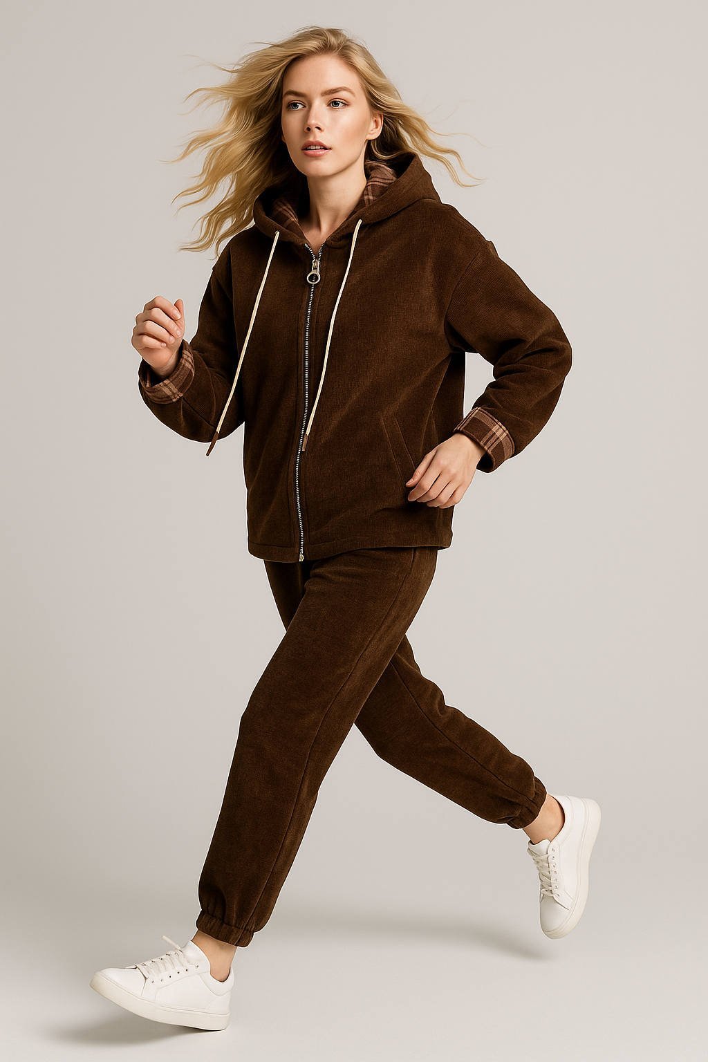 İtalyan İnce Çizgili Kadife Kapşonlu Kahve Rengi Kareli Kombinli Eşofman