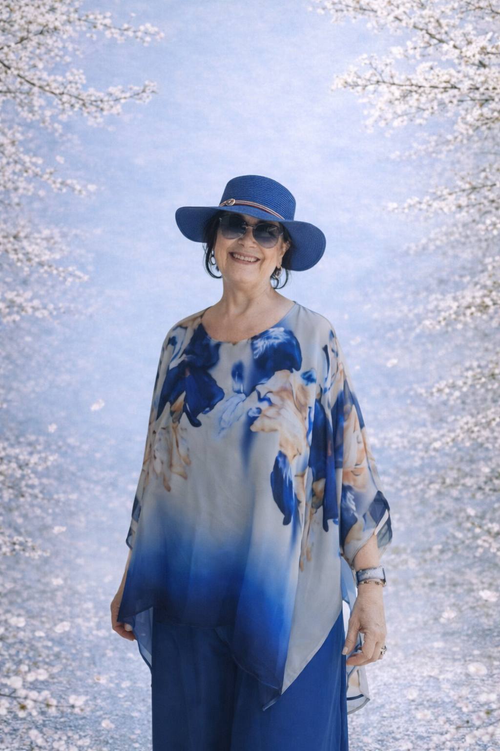 İtalyan İpek Lacivert Çiçek Desenleri Olan Degrade Pantalonlu Takım