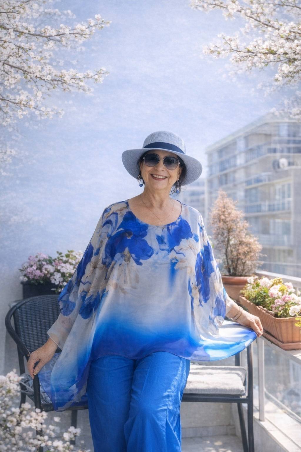 İtalyan İpek Saks Rengi Çiçek Desenleri Olan Degrade Pantalonlu Takım
