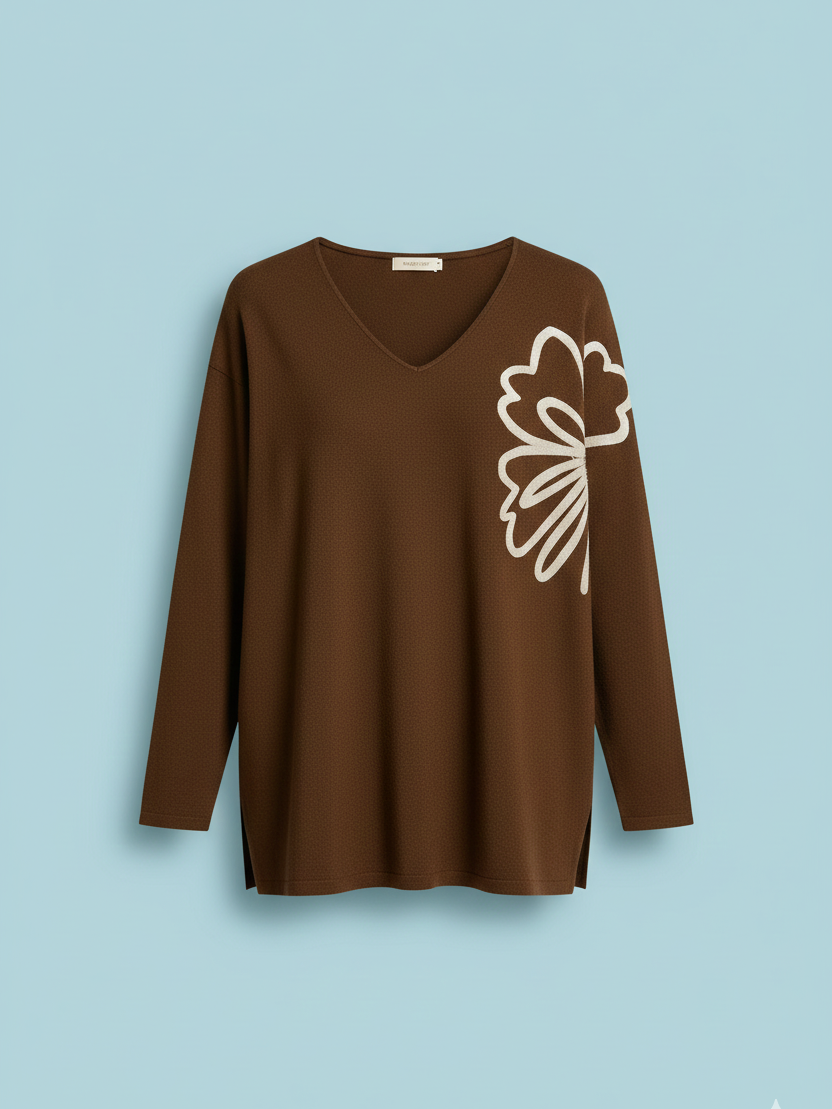 %60 pamuk, %30 akrilik, %10 likra içeriklidir. Yumuşak dokulu triko kumaşıyla gün boyu konfor sunar. V yaka detayı feminen bir hava katarken, yan kısmındaki büyük kemik tonlu çiçek motifi kazığa sanatsal bir dokunuş katar. İtalyan kalıbı ile hem zarif hem iddialı bir duruş sunar.