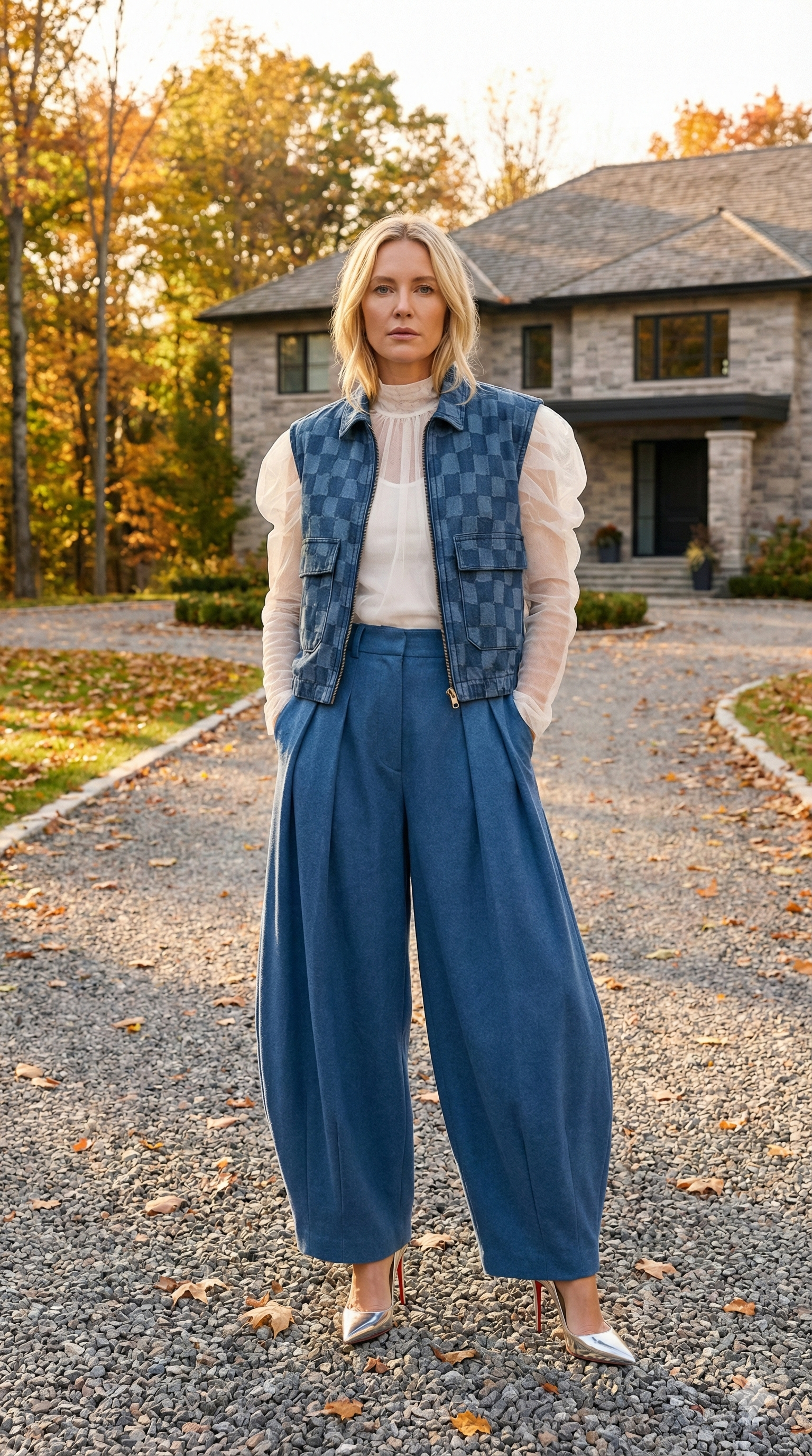İtalyan Kareli Jean Yelek Etegi Büzülebilir Fermuarlı Cepli Yelek