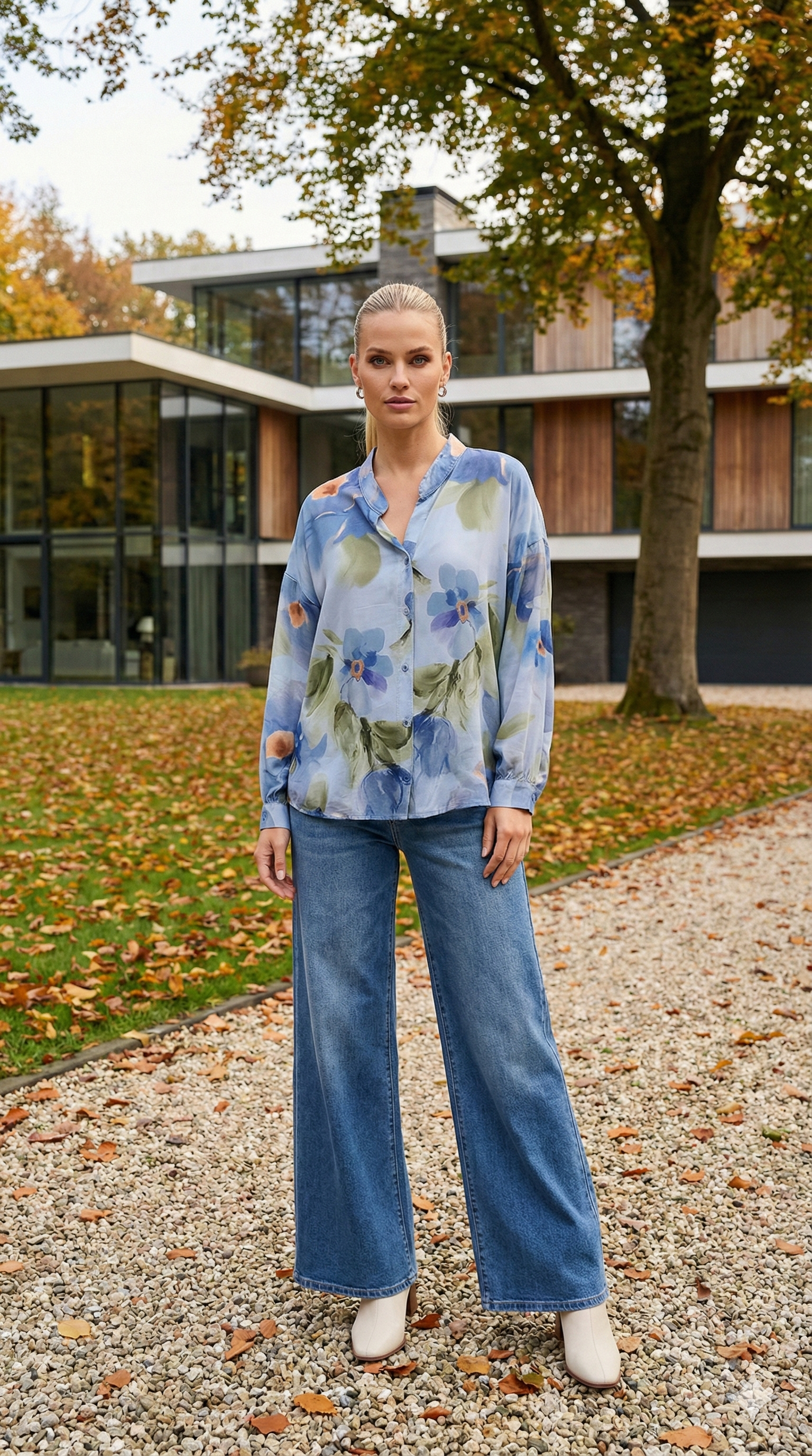 İtalyan Mavi Desenli Hakim Yaka Kollu Viskon Gömlek
