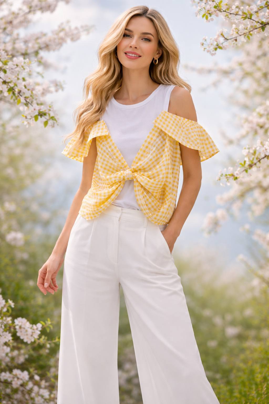 İtalyan Sarı Kareli Kolları Esprili Cotton Bluz
