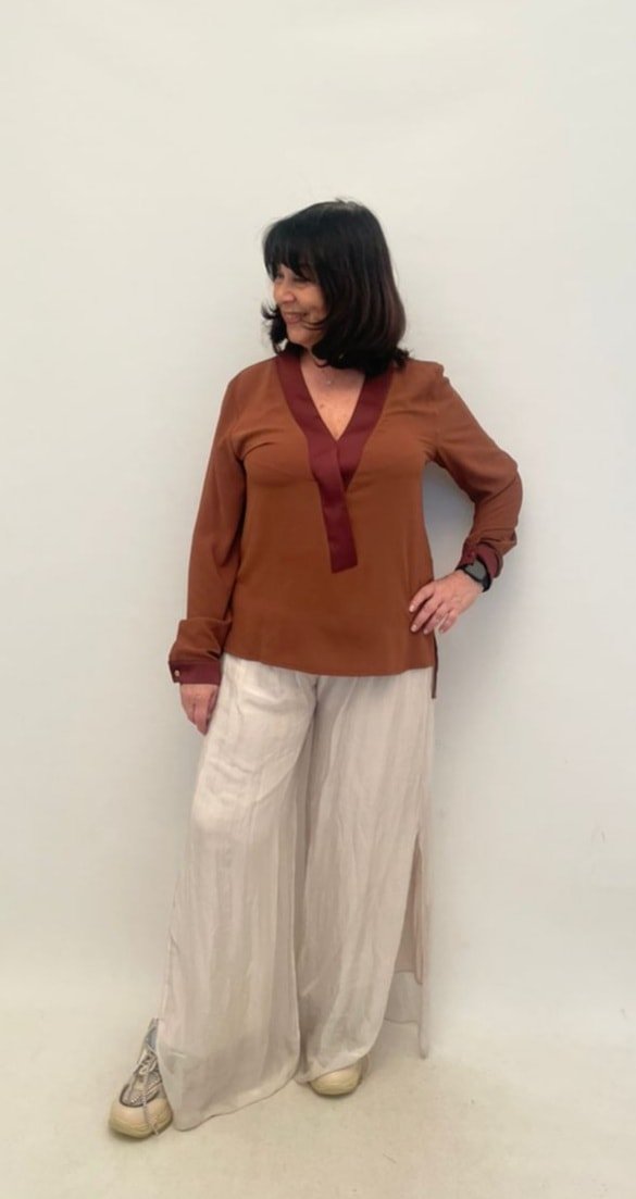 Kahve V Yaka Saten Bluz
