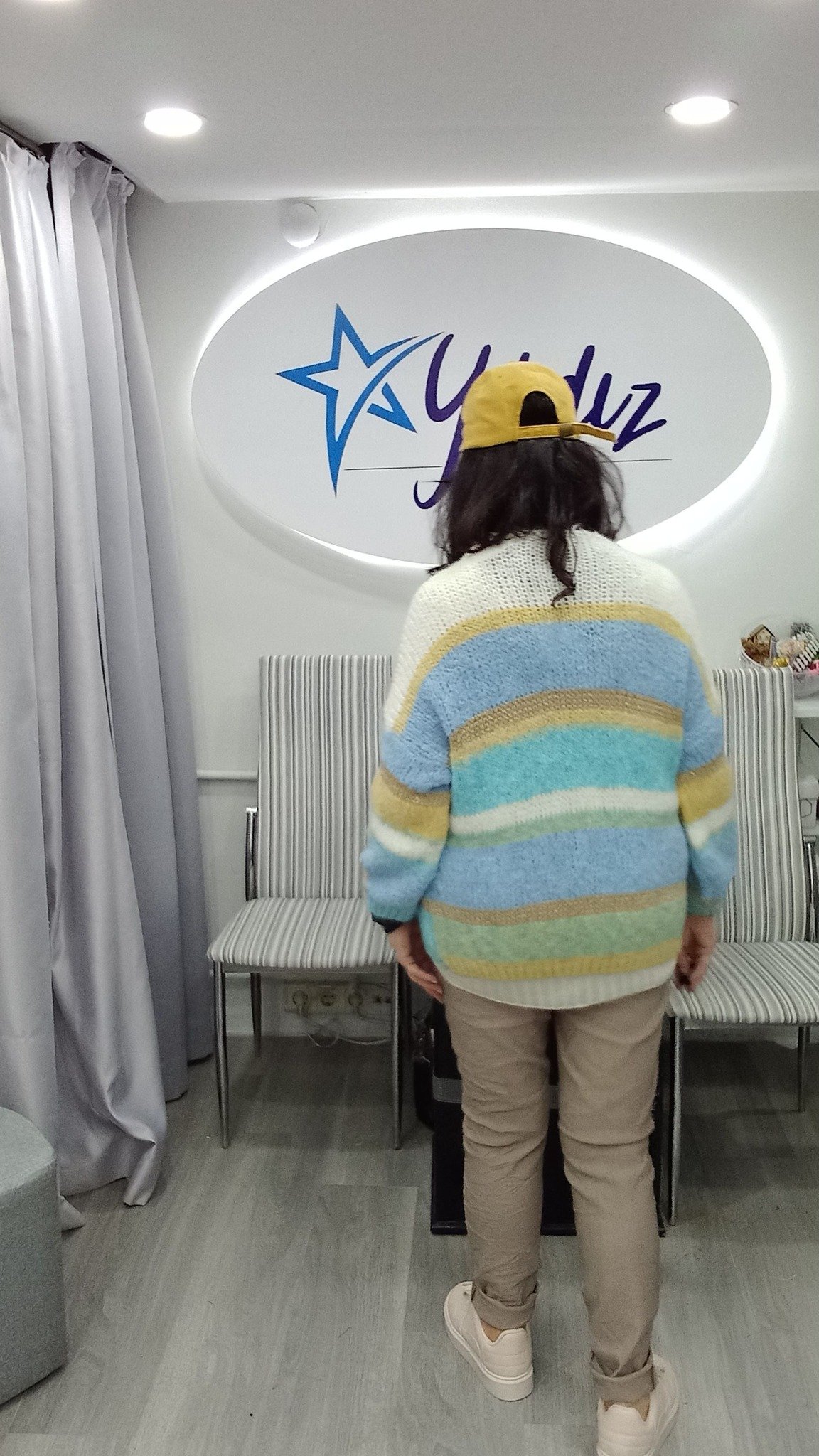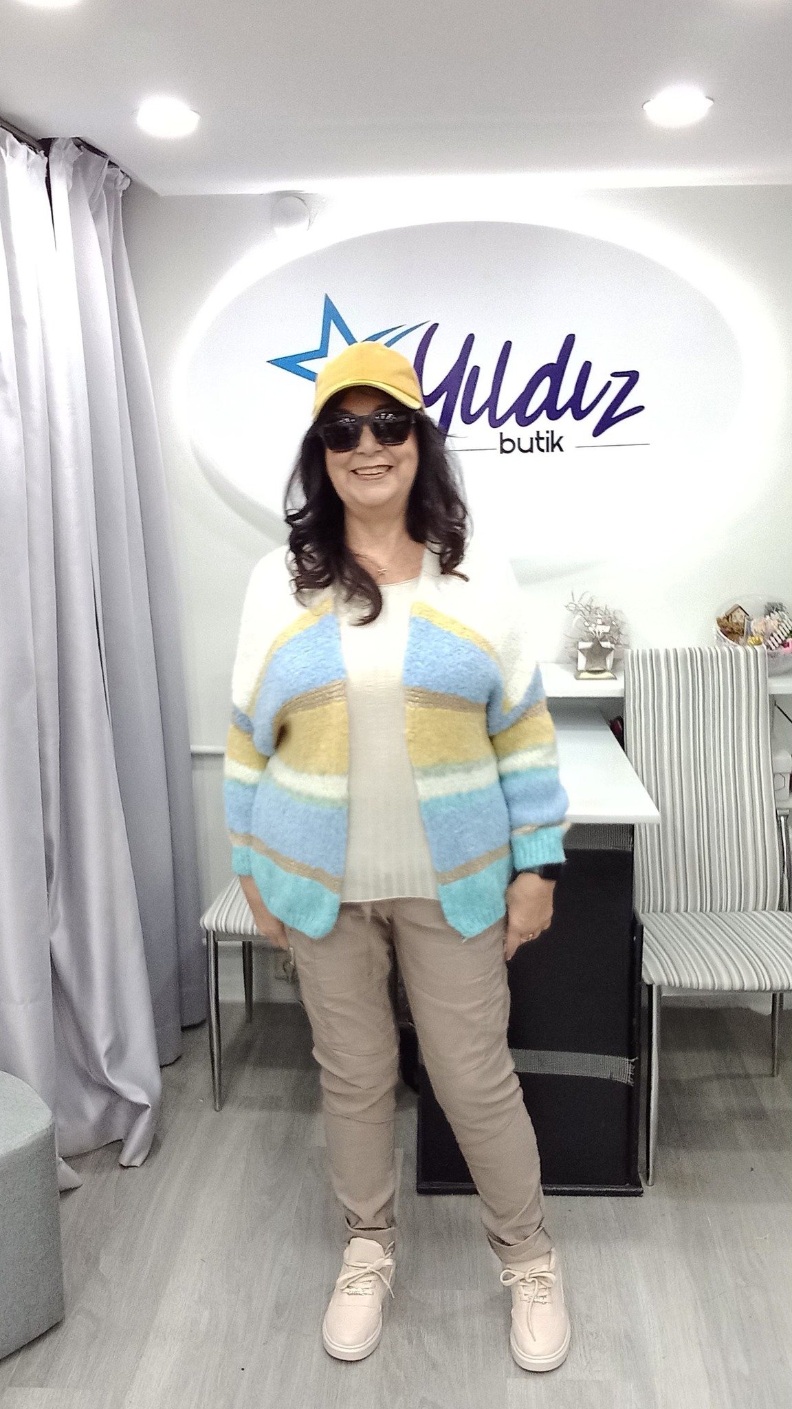 Kemik Vizon Sarı Çizgili italyan Yumuşacık Dügmesiz Hırka