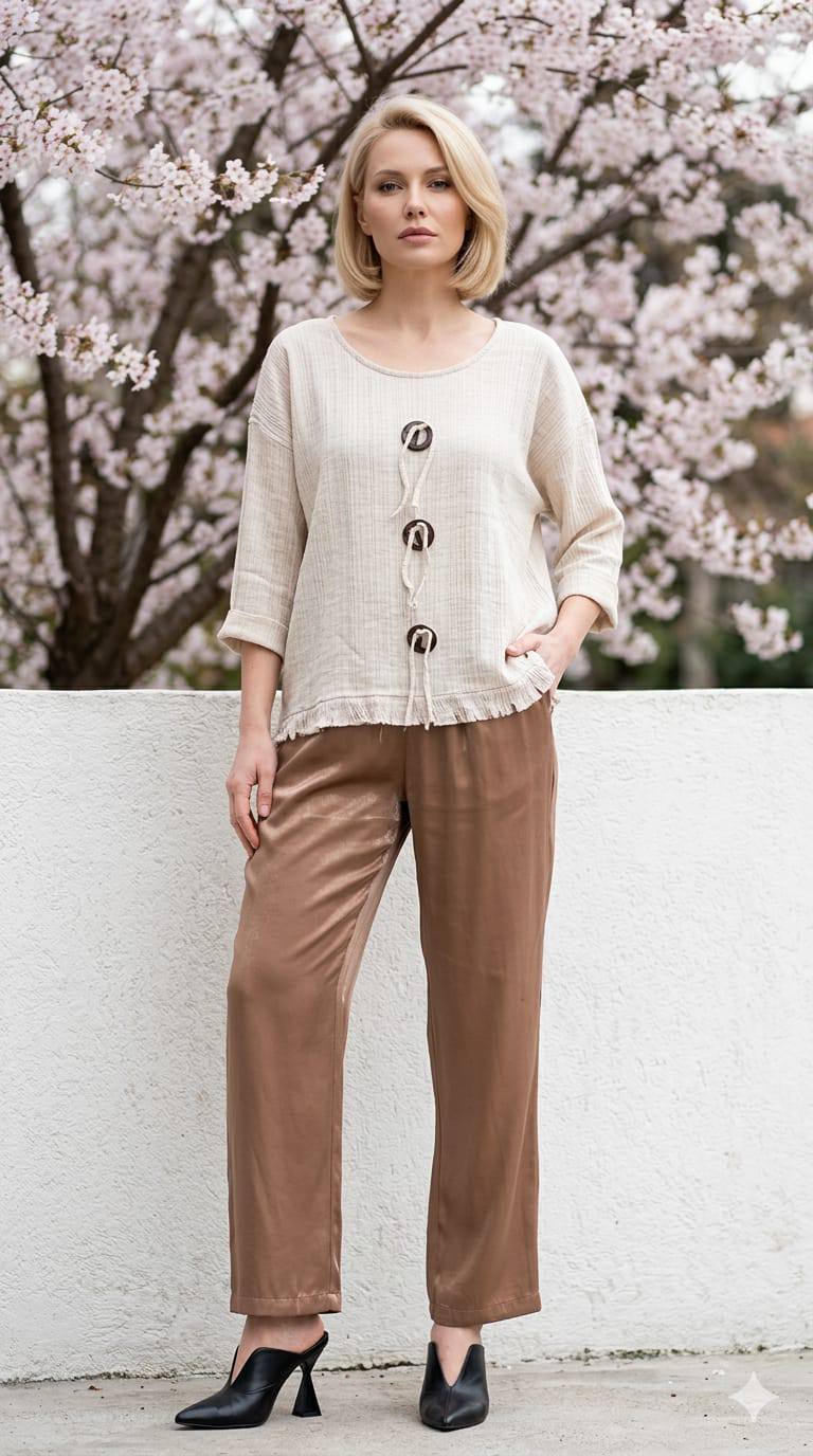 Keten İplik Bej Rengi Büyük Dügmeli Truakar Kollu Bluz