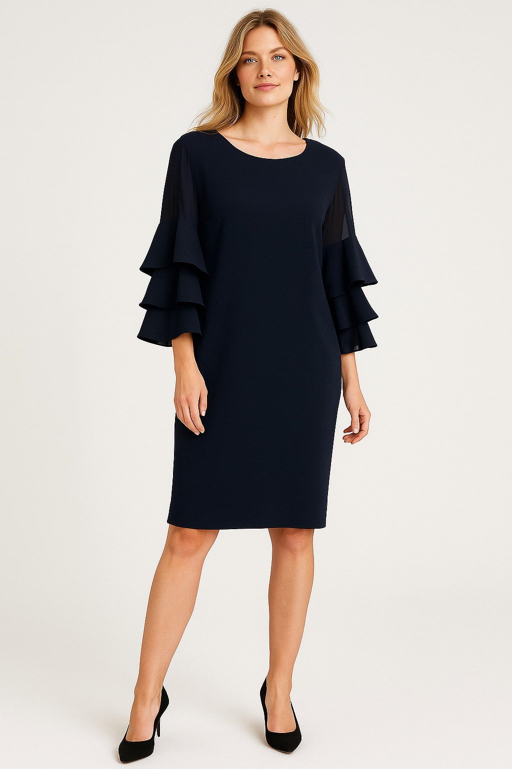 Lacivert kolları fırfırlı diz boyu elbise