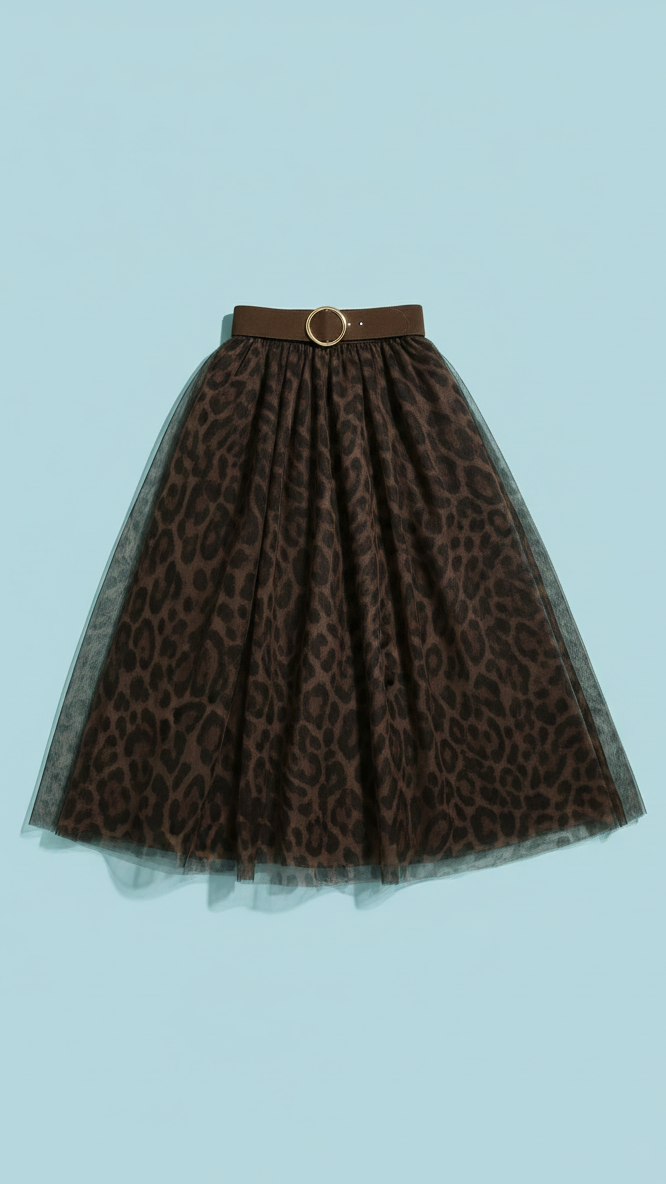 %80 polyester tül, %20 viskon astar içeriğiyle hafif, akışkan ve ten dostu. Kat kat tül yapısı sayesinde hareketli bir siluet sunar; leopar desenli yüzeyi ile cesur ama şık bir duruş yakalar. Belden lastikli yapısı ile konforludur. Hem günlük kombinlerde hem özel davetlerde fark yaratmak isteyenler için.