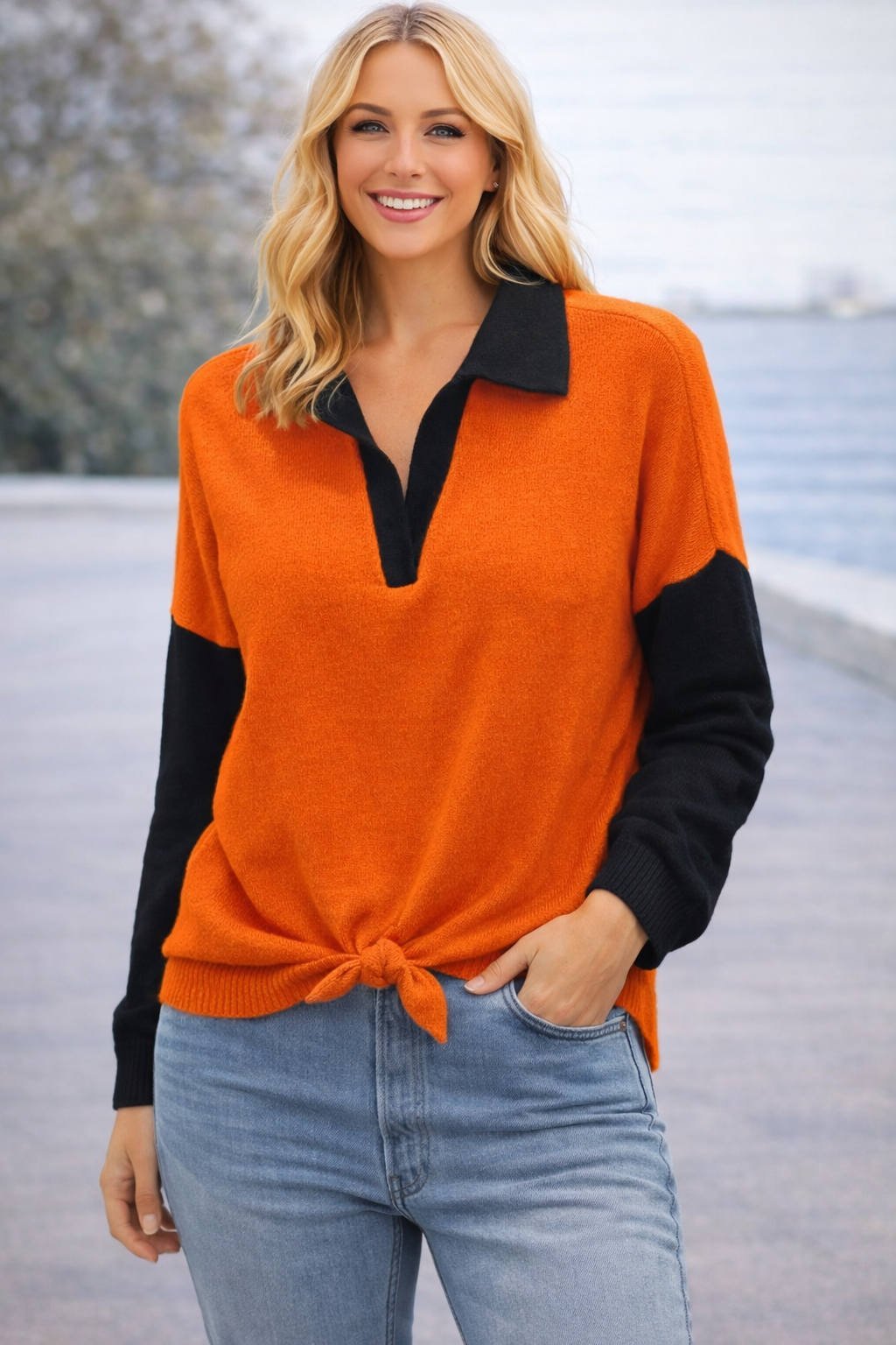 Oranj Siyah Yakalı İki Renkli Triko Kazak