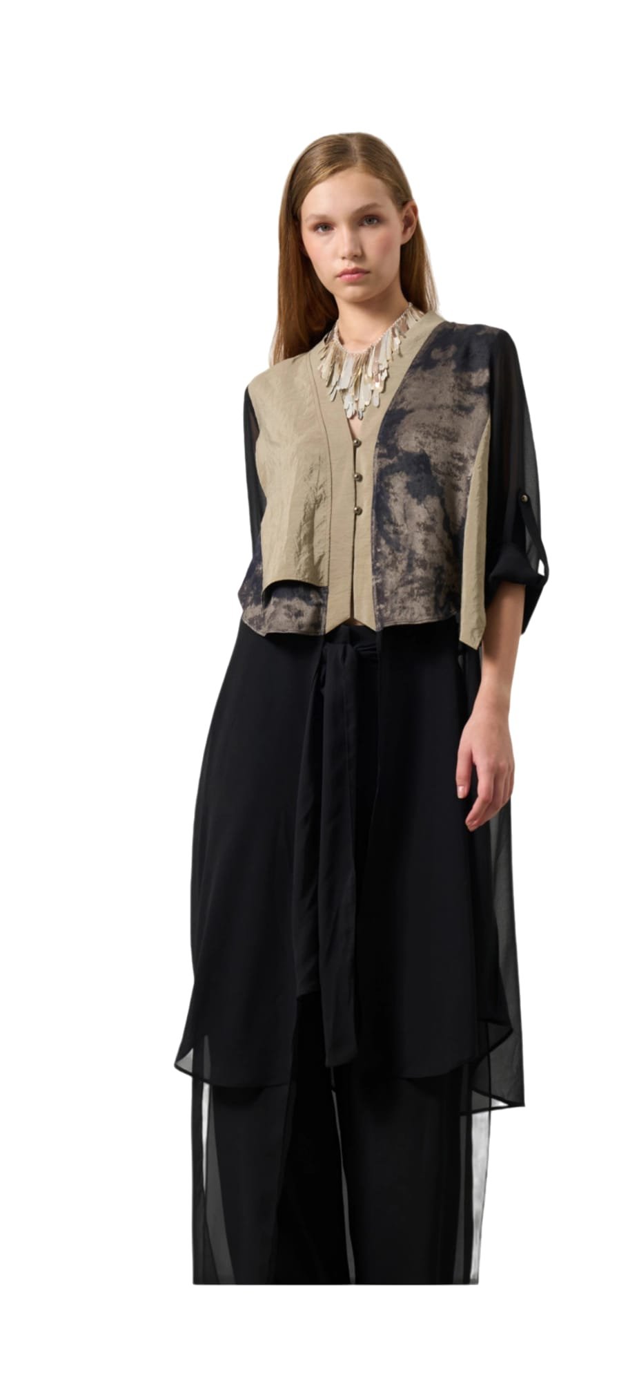 %65 viskon, %25 polyester, %10 tül karışımıyla hafif, akışkan ve transparan dokulu. Ön ve kol bölgesindeki siyah desenli tül detayları ile hem feminen hem iddialı bir duruş sunar. Uzun kesimiyle ister elbise ister tunik olarak kullanılabilir. Kat kat giyimde cesur bir tamamlayıcı.