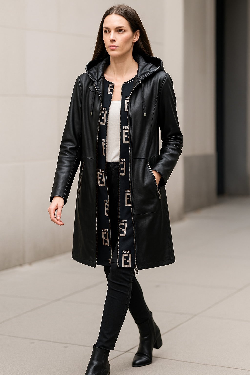 Siyah Hakiki Deri Kapşonlu Diz Altı Pardesü