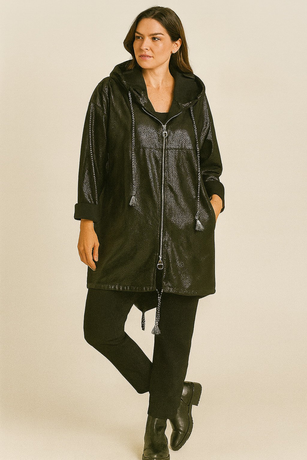 Siyah Parlak Baskılı Yapay Deri Kapşonlu Fermuarlı