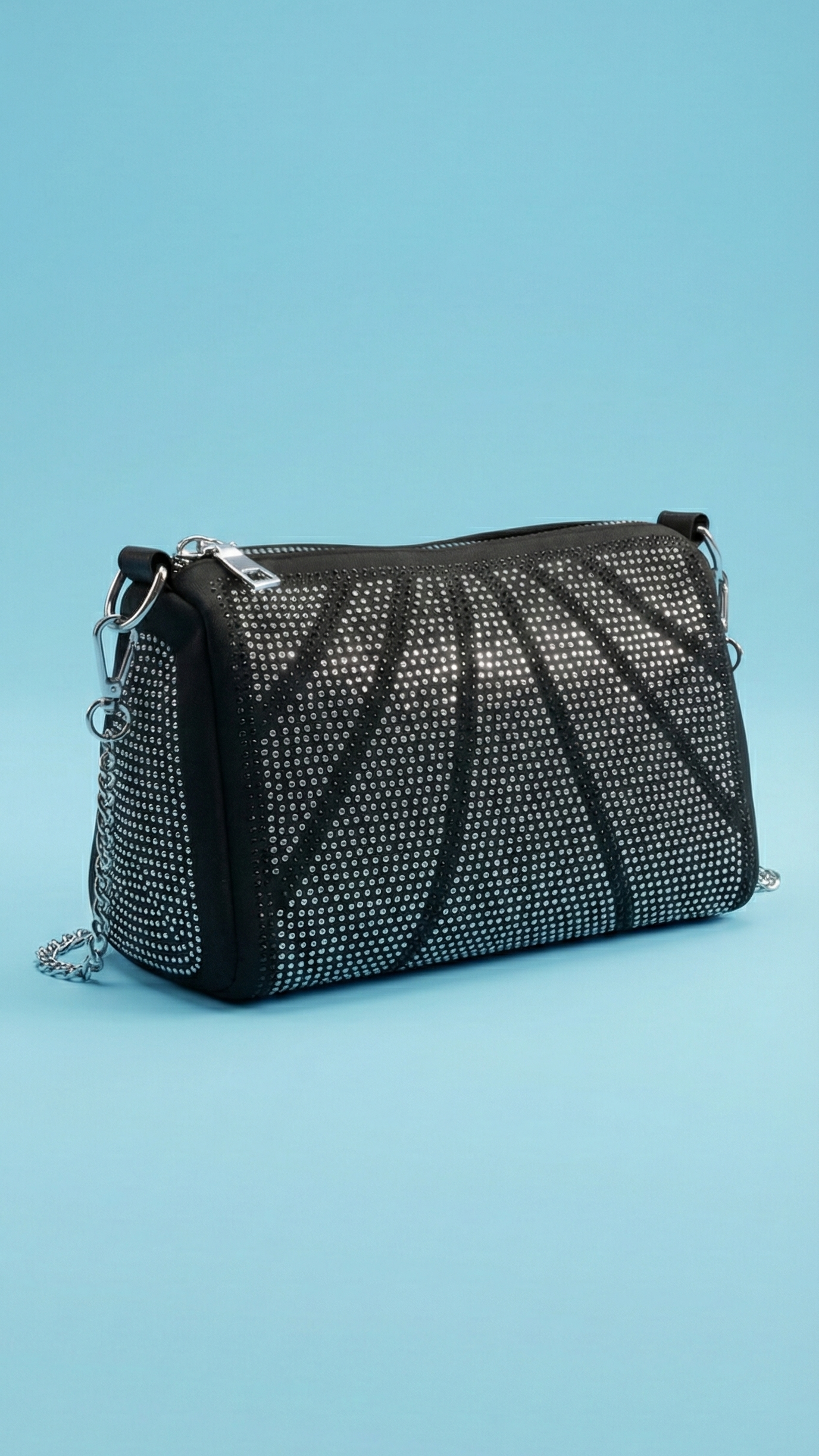 %90 parlak taş kaplama, %10 polyester astarlı. Kompakt ve bombeli formu ile elde taşımaya uygun, içinden çıkan uzun zincir askısıyla omuzda da kullanılabilir. Tamamı ışıltılı taşlarla kaplı yüzeyiyle gece kombinlerinin yıldızı olur. Özel davetler, düğünler ve partiler için ideal.