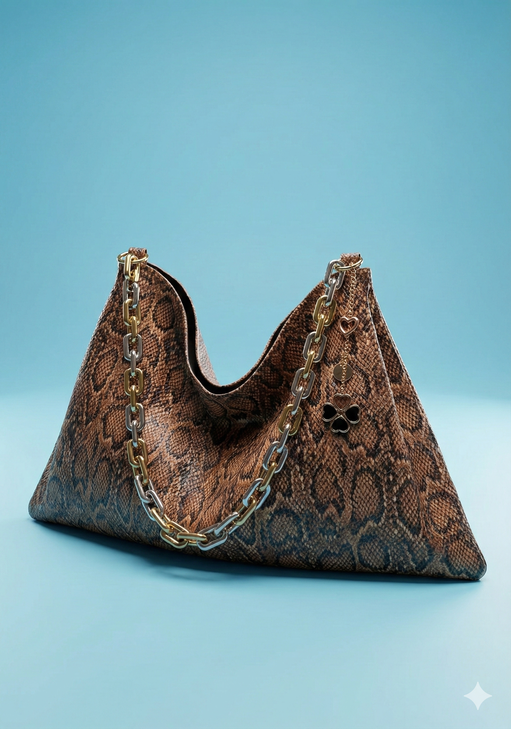 %90 suni deri (yılan baskılı), %10 metal aksesuar. Kayık formundaki şık gövde yapısı ve altın rengi zincir sapıyla modern ve güçlü bir duruş sergiler. Taba rengin sıcak tonlarıyla lüks ve bohem çizgiyi birleştirir. Hem elde hem omuzda taşımaya uygundur.