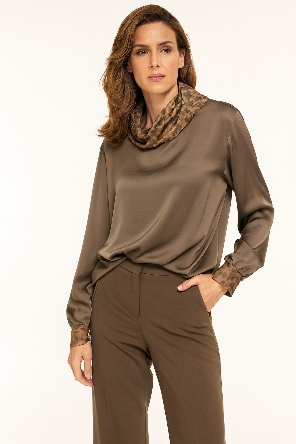 %70 polyester, %30 viskon içerikli hafif saten dokusuyla dökümlü ve parlak bir duruş sağlar. Devrik formdaki leopar desenli yaka, sade tunik kesimine iddialı bir dokunuş ekler. Vizon tonları sayesinde hem ofis şıklığı hem de özel davet stiline rahatça uyum sağlar.