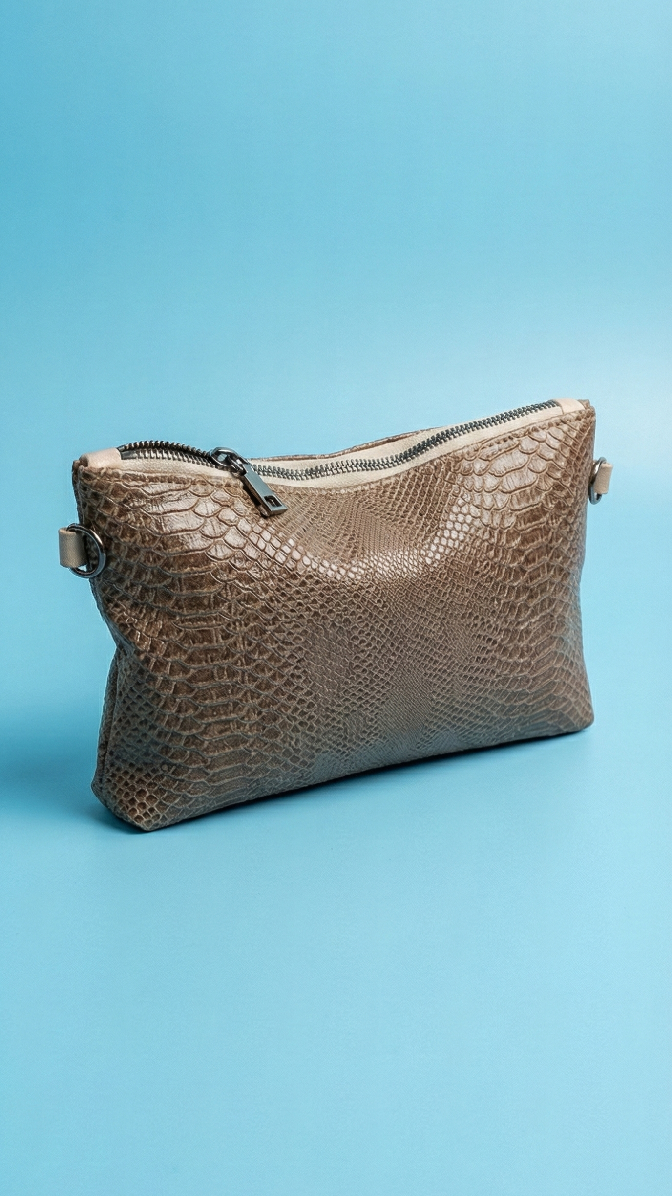 %85 suni deri, %15 pamuk astarlı. Yumuşak örme desenli dış yüzeyi ile dokulu ve zarif bir görünüm sunar. Fermuarlı portföy formu sayesinde hem güvenli hem şık kullanım sağlar. Vizon tonları, tüm tonlarda kombinlerle uyum yakalar; elde taşımaya uygundur.