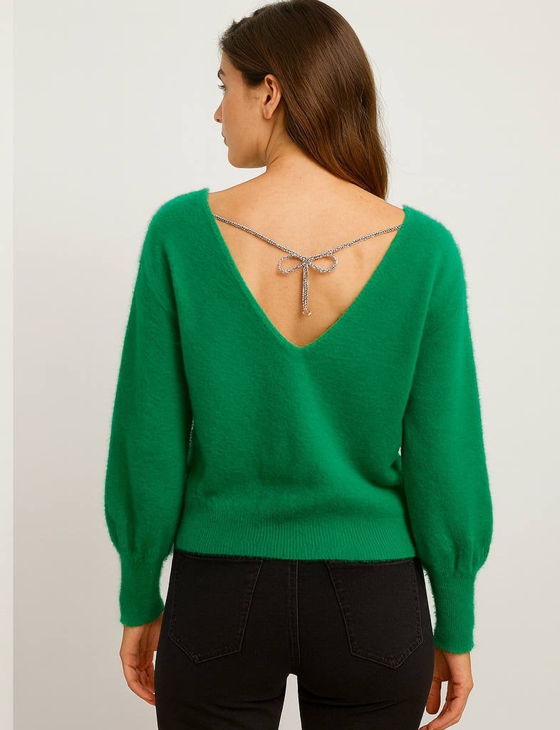 Yeşil Ön Arka V Yaka Arkasında Fiyonk Şeklinde Aksesuarı Olan Triko Kazak