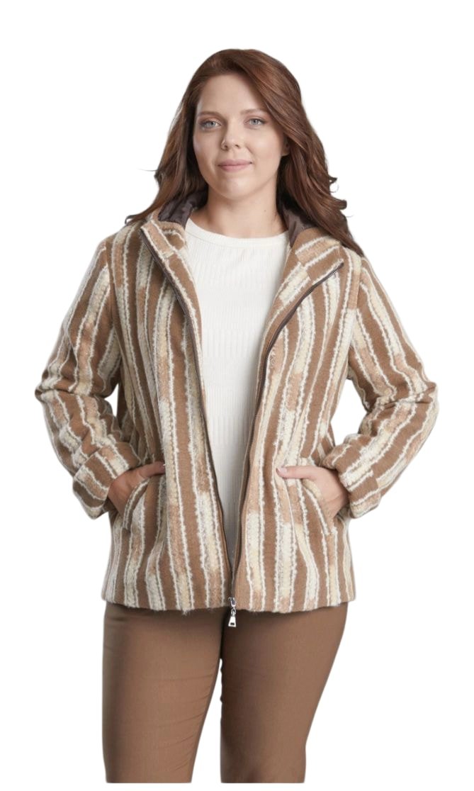Yünlü Bej Kahve Çizgili Kapşonlu Kaban