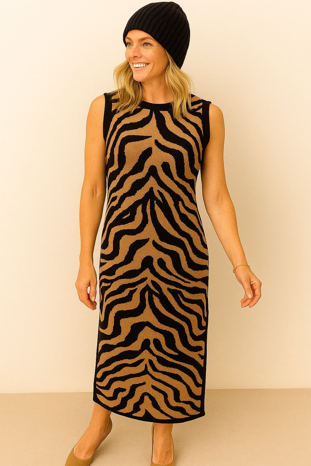 Zebra Desenli Kolsuz Triko Dar Elbise
